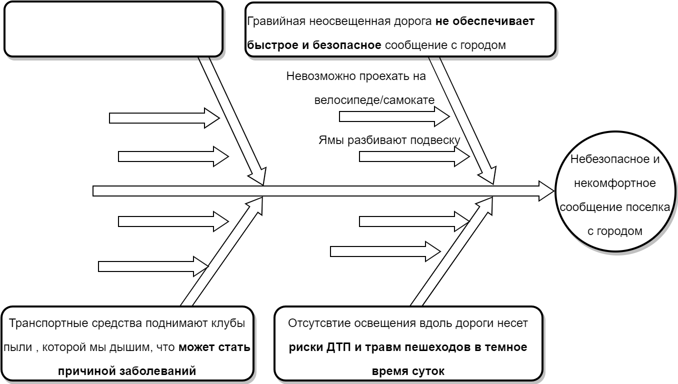 Для (кого? Кто целевая группа?) жителей поселка ХХХ, которым (какая у них потребность?) нужно добираться до города УУУ, необходима (вариант решения проблемы) асфальтированная дорога, которая (перечисляем ключевые выгоды и ценности) обеспечит возможность быстрого и безопасного транспортного сообщения с школой и поликлиникой. Асфальтированная дорога должна включать (перечисляем требования, описывающие ваше решение) освещение, проезжую часть, вело и пешеходную дорожки. Эта асфальтированная дорога (аргументация и показатели, характеризующие ценность) позволит сократить время подъезда к школе и поликлинике на 70%, а также снизить количество ДТП на 20%. В отличие от существующей сейчас гравийной дороги, (преимущество нашего решения и его ценность) асфальтированная дорога будет являться надежным путем сообщения в любую погоду и любое время суток, а также снизит пылевое загрязнение прилегающей территории.