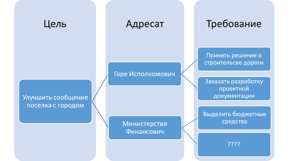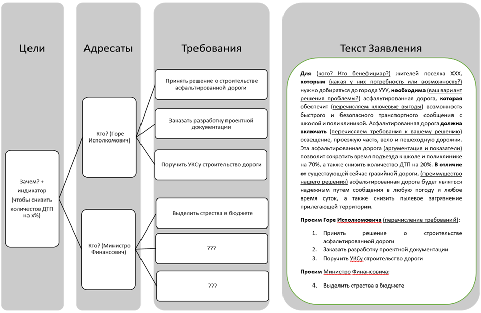Задание 3. На основе результатов выполнения предыдущих упражнений, составьте карту для вашей проблемной ситуации, которая будет включать цели кампании, носителей обязанностей, соотнесённых с требованиями, и текст обращения как в примере (рис. 4).