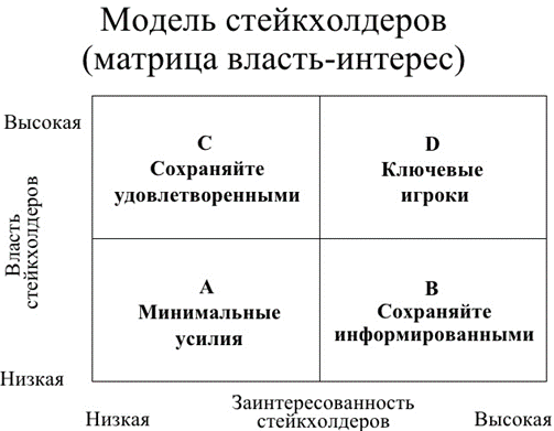 Первой фазой в анализе заинтересованных сторон является их выявление и поиск. Следующий шаг – создание досье на каждую заинтересованную сторону, определение силы, влияния и интересов каждой из сторон. Заключительный шаг – выделение наиболее важных игроков, чтобы предугадать их возможные ответные ходы и по возможности заручиться поддержкой или, наоборот, нейтрализовать их негативное влияние на развитие ситуации.