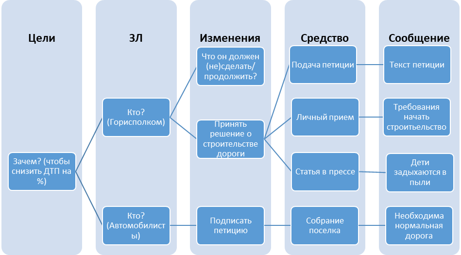 Когда у нас есть четко сформулированная проблема и набор ее причин, мы можем приступать к выработке решения проблемы на основе как наших потребностей, так и потребностей целевой группы, и в этом помогает техника «картирования потребностей». Эта техника позволяет визуализировать и соотнести требования с носителями обязанностей (адресатами) и целями кампании. Для этого необходимо: