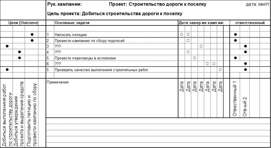 Шаг первый – определитесь с тем, какой результат вам необходим от коммуникации с каждой заинтересованной группой. Цели кампании у вас уже есть, если вы выполнили задания в предыдущих разделах. Теперь соотнесите заинтересованные стороны (стейкхолдеров) с ожидаемыми результатами воздействия. Напомним, результатом воздействия должно быть информирование, изменение убеждений или побуждение к действию (бездействию). Например, для приведенного выше примера с посёлком активисты, скорее всего, захотят побудить к действию в виде активного продвижения петиции автомобилистов и родителей, информировать общественность и жителей посёлка о петиции и преимуществах предложенного решения, побудить власти к выделению средств и строительству дороги, изменению убеждений ГАИ и милиции о необходимости строительства дороги.