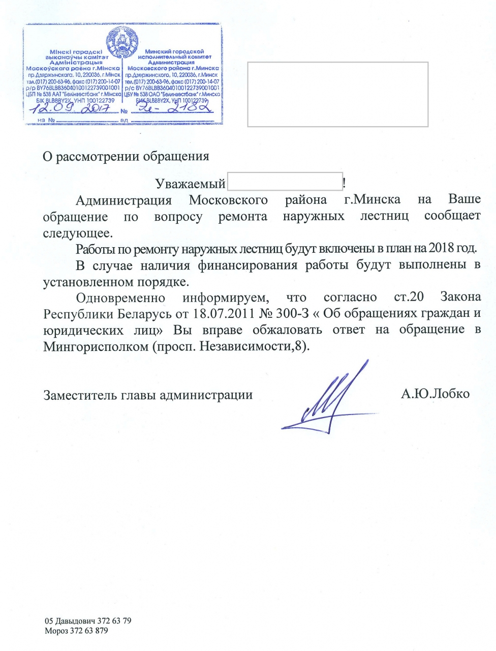 Во дворах домов 107 и 117 по улице Есенина много лет находятся 3 пешеходные лестницы в ненадлежащем состоянии. Начиная с 20 декабря 2015 года писали о проблеме через сайт 115.бел. Заявки закрывали с формулировкой: "Произведен ремонт лестницы", однако, лестницы так и оставались в неисправном состоянии. Последующие запросы постоянно ставятся на контроль и сроки ремонта постоянно переносятся из-за "недостаточного финансирования". В очередной раз ремонт перенесли на март 2018 года. Прошу принять меры и привести эти лестницы в надлежащее состояние, так как все они ведут к школе и двум детским садам, по ним ежедневно ходят люди. В таком состоянии лестницы представляют опасность, особенно в зимнее время, так как зимой они превращаются в горки.