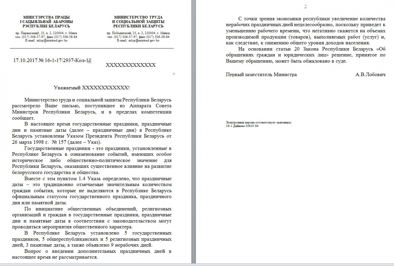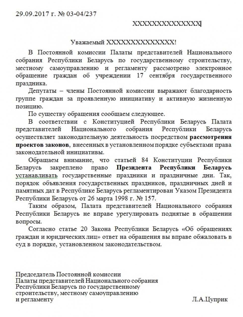 Палата представителей Национального собрания Республики Беларусь не вправе урегулировать поднятые в обращении вопросы. Государственные праздники и праздничные дни устанавливает Президент.