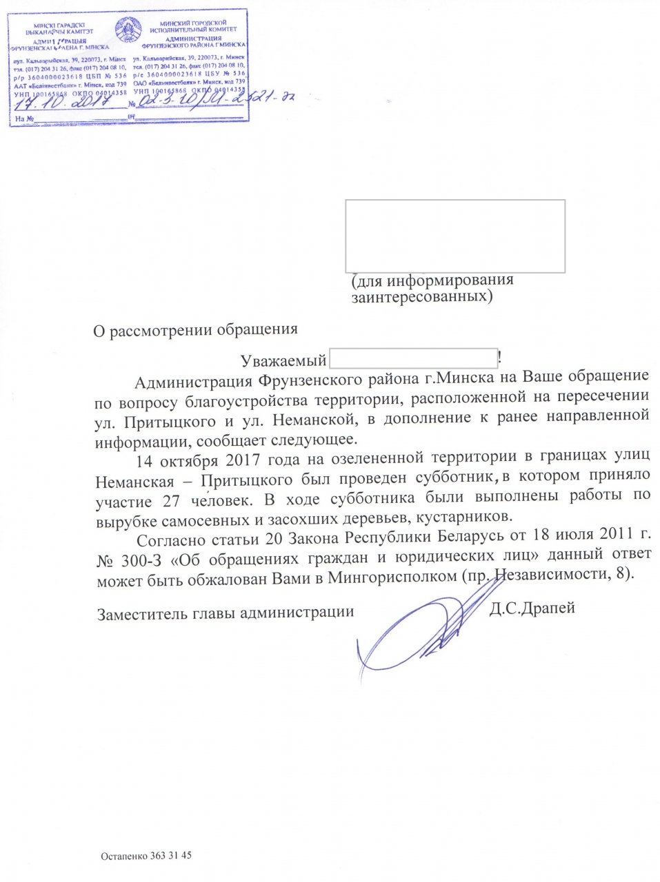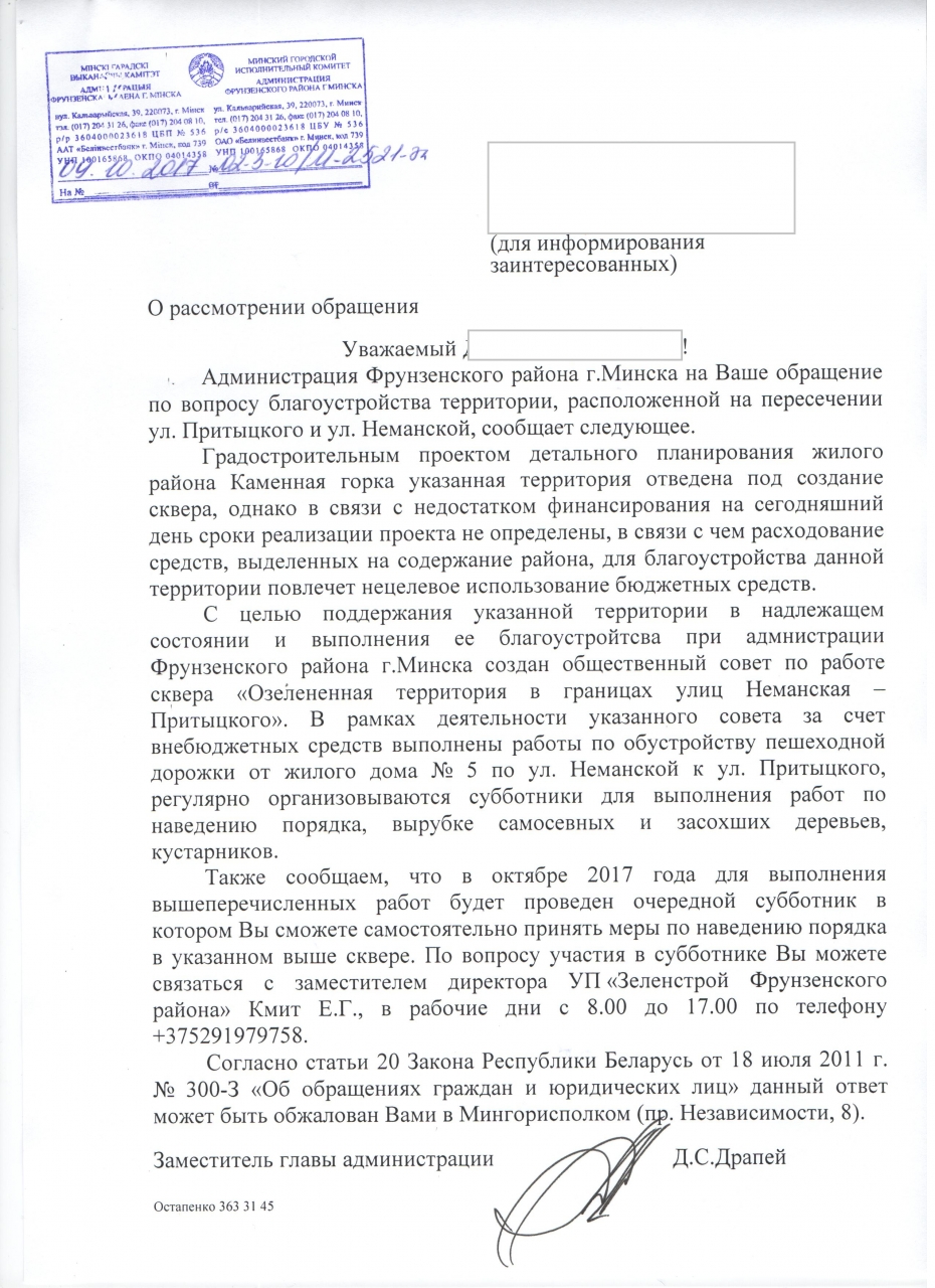 Просим выполнить благоустройство территории парка на пересечении ул. Притыцкого и ул. Неманская. Необходимо произвести очистку территории от старых деревьев и зарослей, высадить нормальный газон, создать удобные аллеи и места отдыха с лавочками.