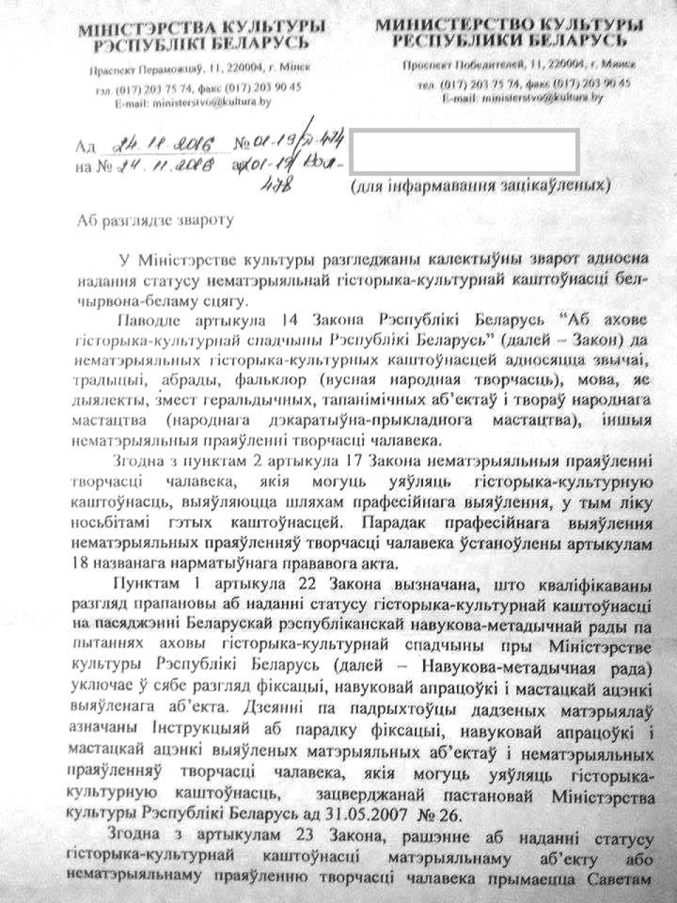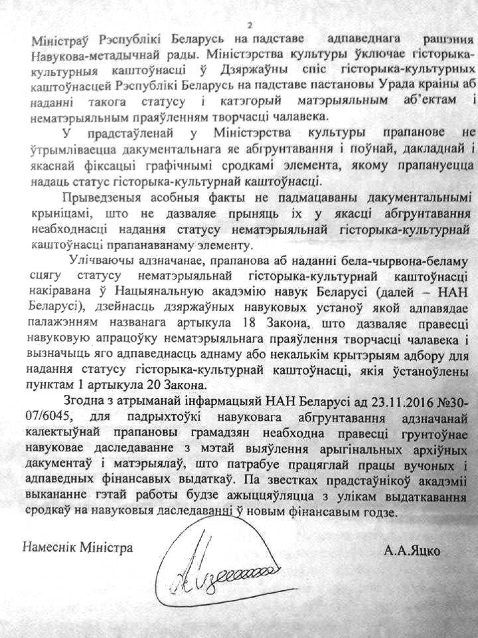 Такім чынам, на падставе часткі 2 пункта 2 артыкула 90 Кодэкса («прапановы аб наданні нематэрыяльным культурным каштоўнасцям статусу гісторыка-культурнай каштоўнасці ўносяцца ў пісьмовай форме ў Міністэрства культуры») просьба разгледзціць пытанне аб наданні бел-чырвона-беламу сцягу статус нематэрыяльнай культурнай каштоўнасці. Паводле падпункта 3.1. артыкула 96 Кодэкса просьба разледзіць пытанне аб прысваенні бел-чырвона-беламу сцягу як нематэрыяльнай культурнай каштоўнасці катэгорыі «А» (гiсторыка-культурныя каштоўнасцi, поўная аўтэнтычнасць i дакладнасць якiх безумоўныя i нязменныя).