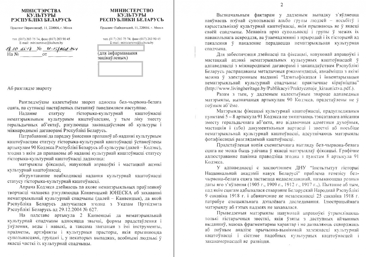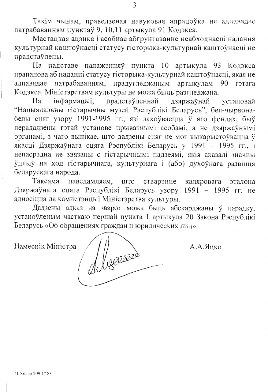 Як вынікае з адказу дырэкцыі Нацыянальнага гістарычнага музея, у яго фондах захоўваецца Дзяржаўны сцяг Рэспублікі Беларусь узору 1991-1995 гг. (Гл.: Дадатак 11). Просьба да міністэрства культуры высветліць, якое палотнішча захоўваецца ў фондах музея: ці гэта непасрэдна тое палотнішча, якое якое выконвала ролю Дзяржаўнага сцяга Рэспублікі Беларусь у 1991-1995 г., ці гэта, сцяг, які быў перададзены на захоўванне фізічнай, юрыдычнай асобой, альбо грамадскім аб’яднаннем, палітычнай партыяй? У выпадку, калі дадзены экспанат з’яўляецца арыгінальным палотнішчам узору 1991-1995 гг., просьба растлумачыць парадак доступу да яго і навуковай працы з ім.