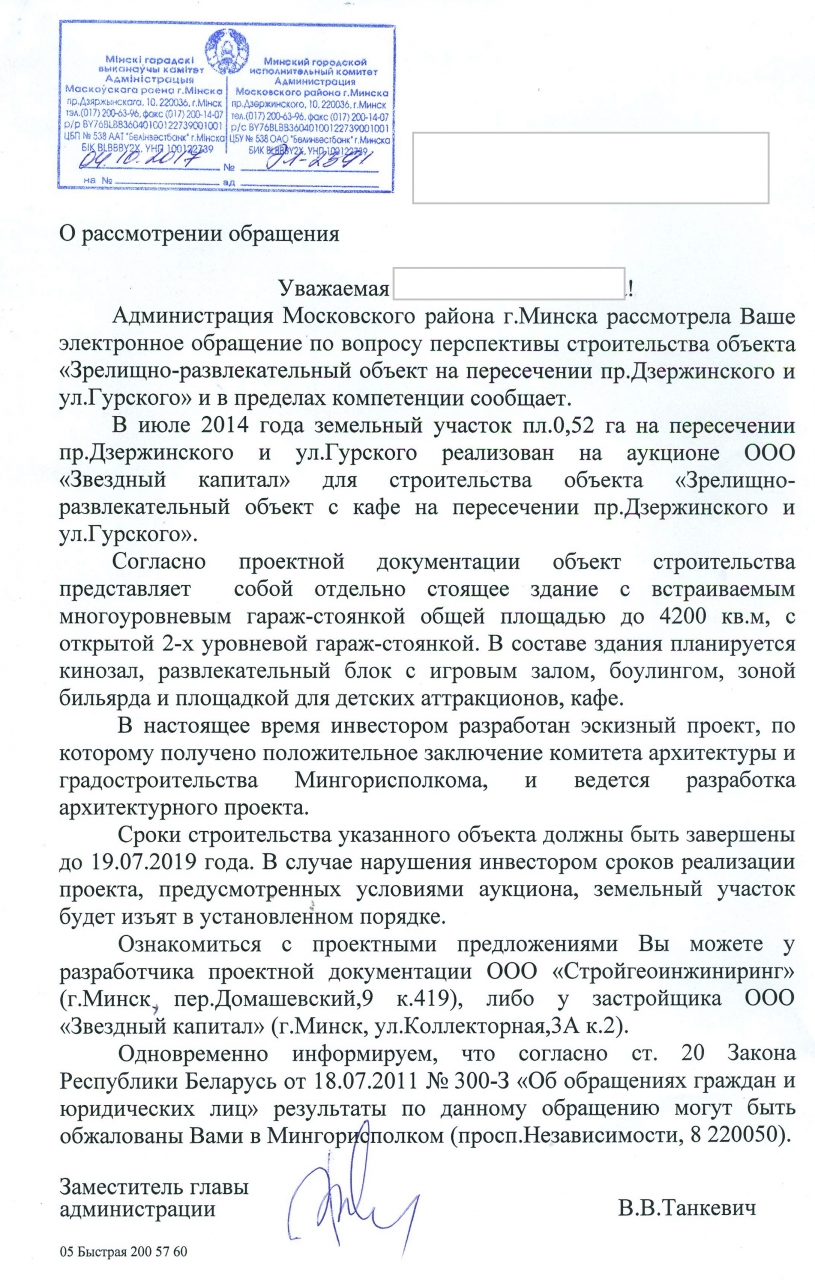 На официальном сайте администрации Московского района размещена информация о том, что ведется проектирование по объекту "Зрелищно-развлекательный объект с кафе по пр.Дзержинского-Гурского (0,54га), ООО «Звездный капитал».