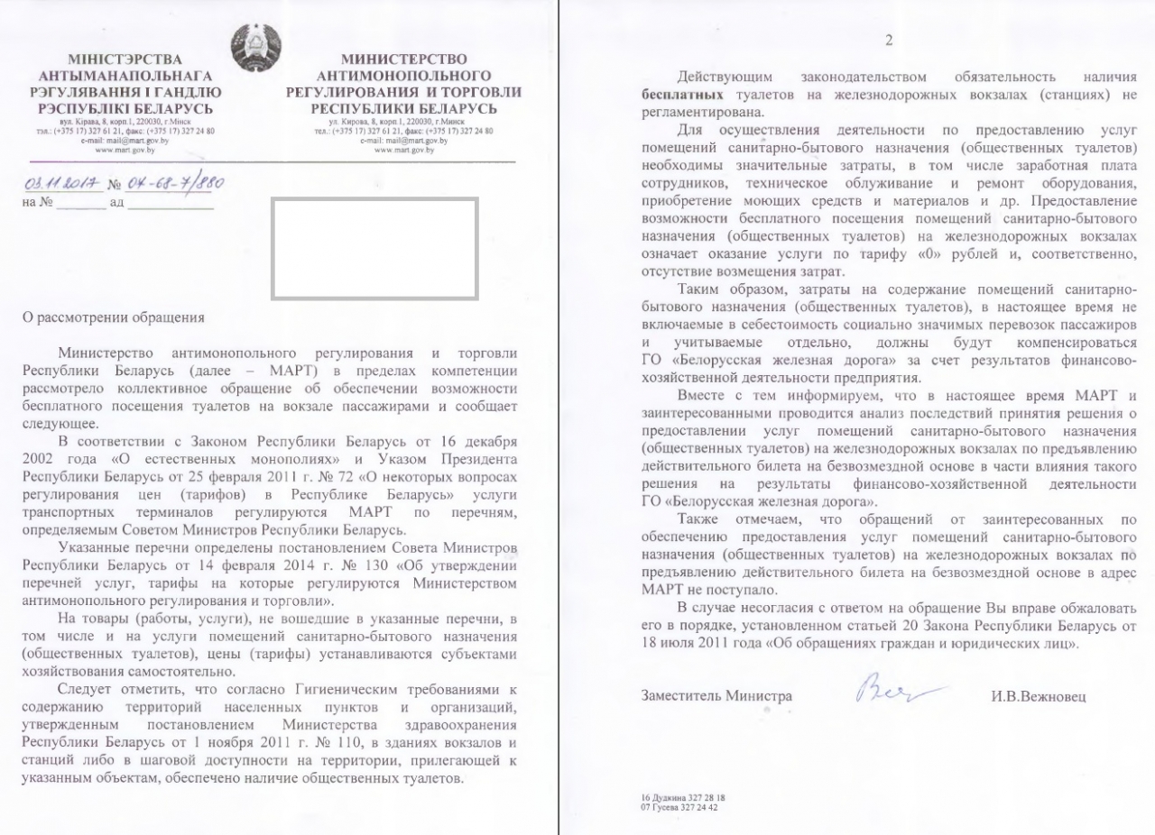 Уважаемые господа антимонопольного регулирования, к вам обращаются сторонники бесплатных общественных туалетов на вокзалах для пассажиров по купленному билету. Волею судьбы и борясь за справедливость, мы, ниже подписавшиеся, защищаем права застрахованных пассажиров, которые, купив билет не имеют возможности бесплатно справить нужду на вокзале. Это обусловлено острой жизненной необходимостью, в элементарных санитарно-эпидемиологических условиях, за которые застрахованный пассажир нечестно вынужден платить дополнительные деньги, чтобы «облегчится» в уборной или просто помыть руки и умыть лицо. Это не правильно. Просим вас, и скорее настоятельно рекомендуем не перенаправлять данное коллективное обращение в Минтранс или другое ниже стоящие ведомство. Вы можете направить его только выше в Совмин хотя бы, но только после своего собственного ответа и предложения рассмотреть его Совмину, так как данный орган рассматривает обращения граждан в соответствии с законом об обращениях граждан, только с обращением от министерств. Будем благодарны вашему содействию в этом.