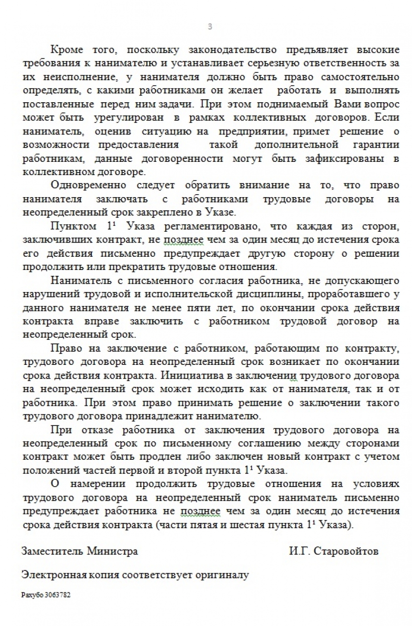 Поднимаемый вопрос может быть урегулирован в рамках коллективных договоров. У нанимателя есть право заключать с работниками трудовые договоры на неопределенный срок.