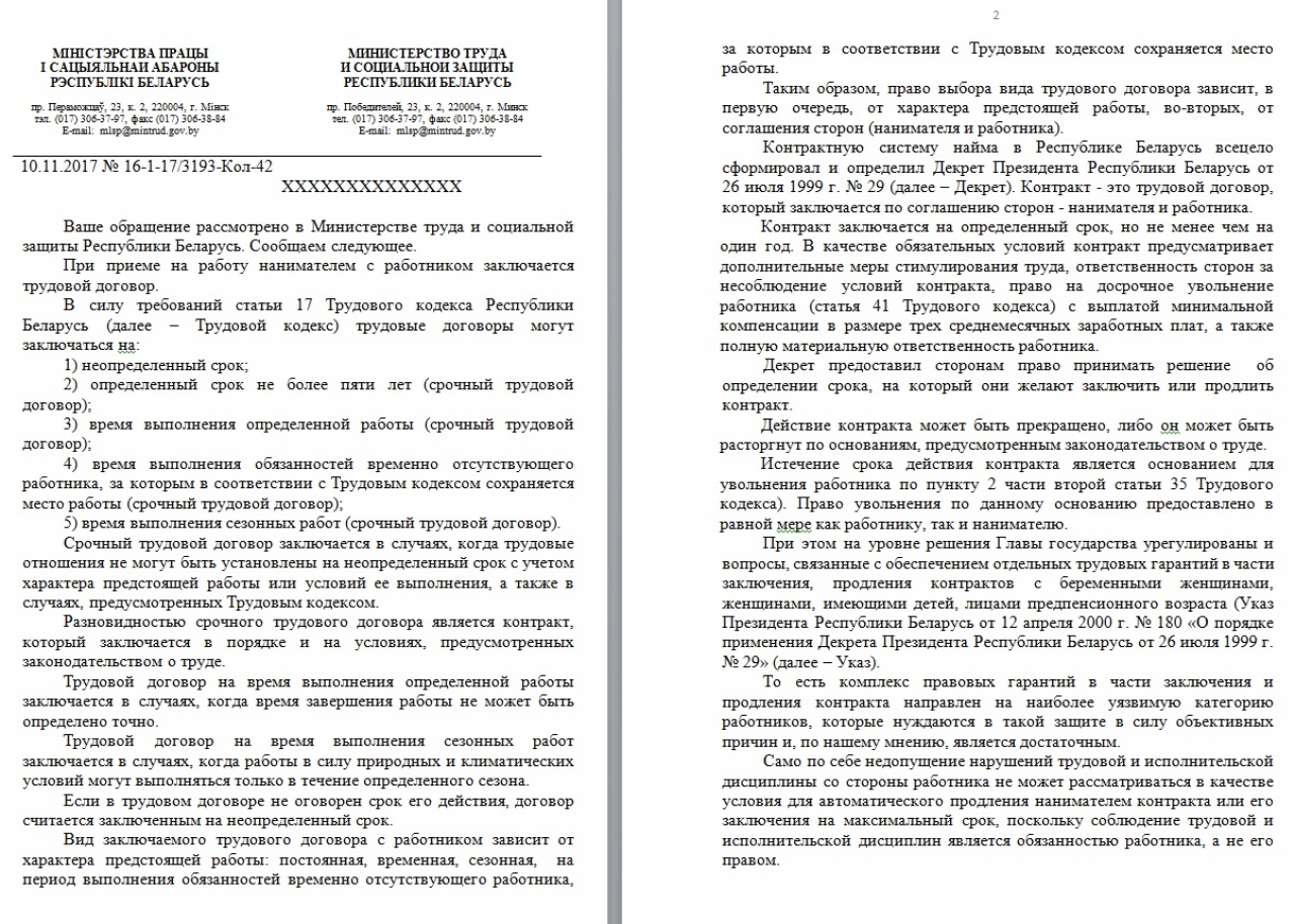 В настоящее время недобросовестными нанимателями не продлеваются контракты работникам по причинам, не связанным с нарушением трудовой дисциплины или невыполнением трудовых обязанностей. Существует проблема, когда при оптимизации или реструктуризации, либо по личным мотивам, в том числе, когда работник пытается отстоять свои права на предприятии работнику просто не продлевают контракт. Для приведения численного количества работников к необходимому существует отработанный механизм — сокращение. Эта система дает возможность и время перетрудоустроиться, сокращенному работнику выплачивается пособие. Непродление контрактов - это один из методов сэкономить предприятию на выплате пособий. Считаем, что в отношении тех, кто работает по контракту, требуются дополнительные меры законодательной защиты, что позволит работникам защищать свои права не боясь непродления контракта со стороны нанимателя.
