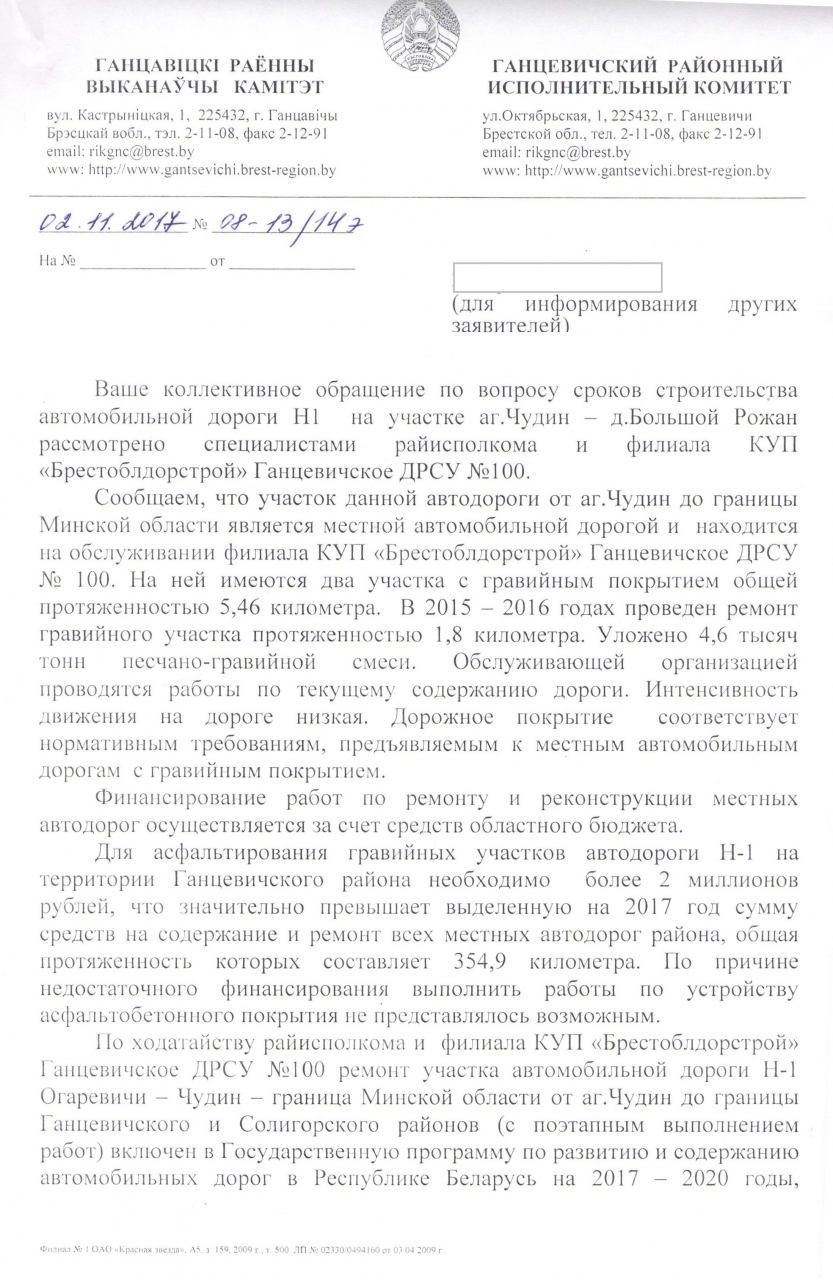 Автодорога Н1 на участке аг. Чудин-д. Большой Рожан на данный момент имеет гравийное покрытие.