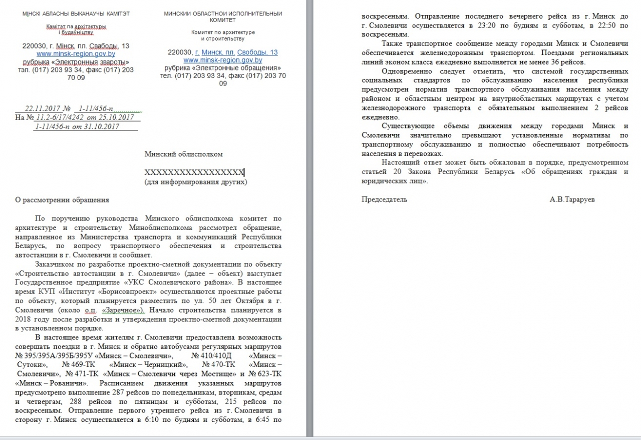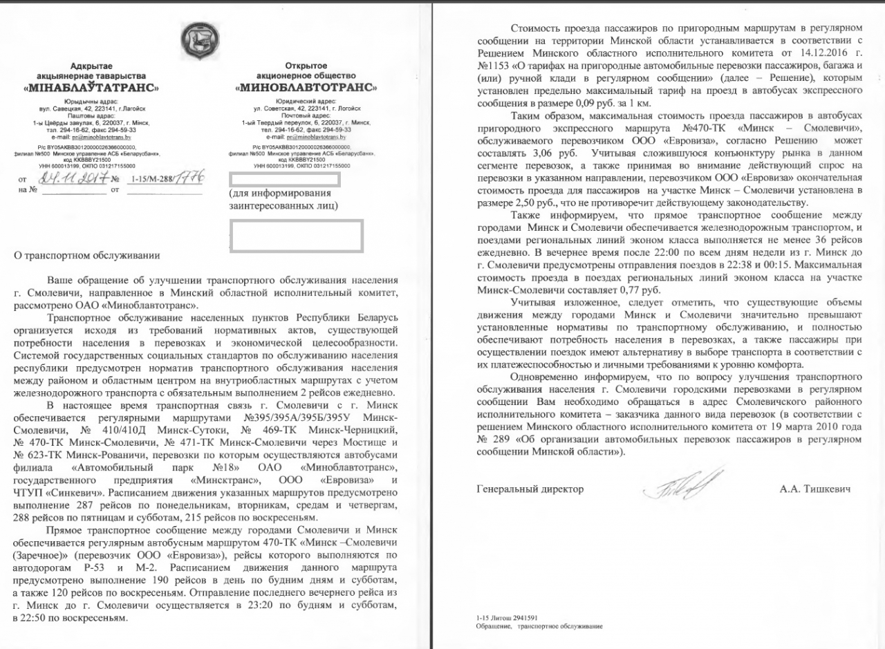 Просим рассмотреть и решить вопрос общественной транспортной схемы, предусмотрев введение прямого транспорта с движением по маршруту Смолевичи - Минск (метро Восток), включив в маршрут остановки в городе Смолевичи: поликлиника, вокзал, ст. Заречная и иные с интервалом пятнадцать минут, а также учитывая пребывания поездов и электричек на железнодорожный вокзал г. Смолевичи.