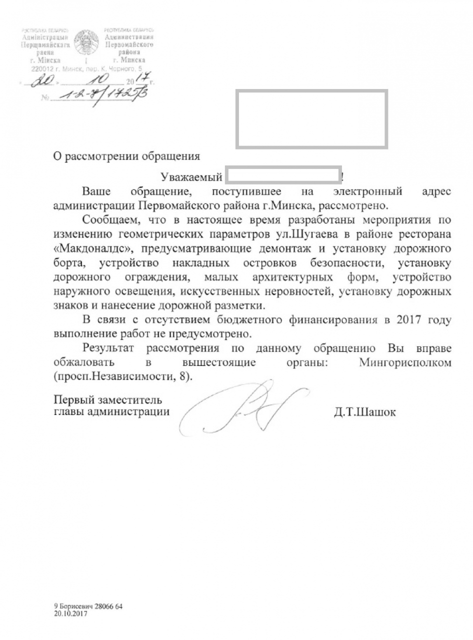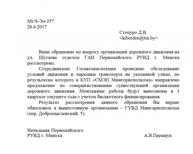 26 июня 2017 года мною получен ответ на электронное обращение (копия прилагается). В данном ответе сообщается, что монтажные работы КУП "СМЭП Мингорисполкома" на участке проезжей части улицы Шугаева напротив ресторана Макдональдс будут выполнены в третьем квартале 2017 года с учётом бюджетного финансирования.