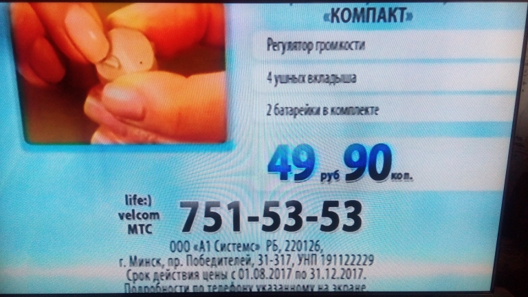 1) На телевидении. Усилитель звуков "Компакт". Рекламный ролик этого устройства выложен на сайте YouTube (https://www.youtube.com/watch?v=y6fT8WwvWEQ). У нас на телевидении данный ролик (но с белорусскими контактными данными - см. прикрепленный скриншот) крутится на телеканале РТР-Беларусь.