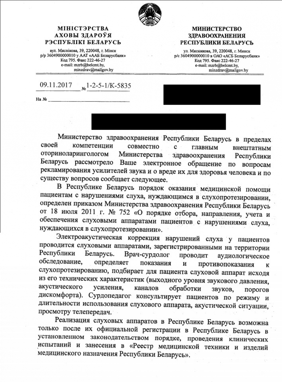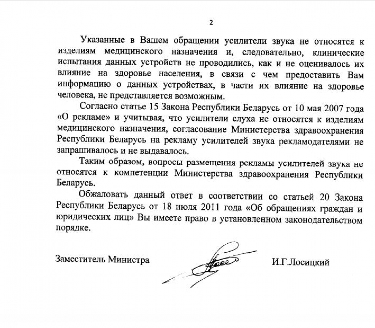 Согласование Минздрава на рекламу усилителей звука рекламодателями не запрашивалось и не выдавалось.