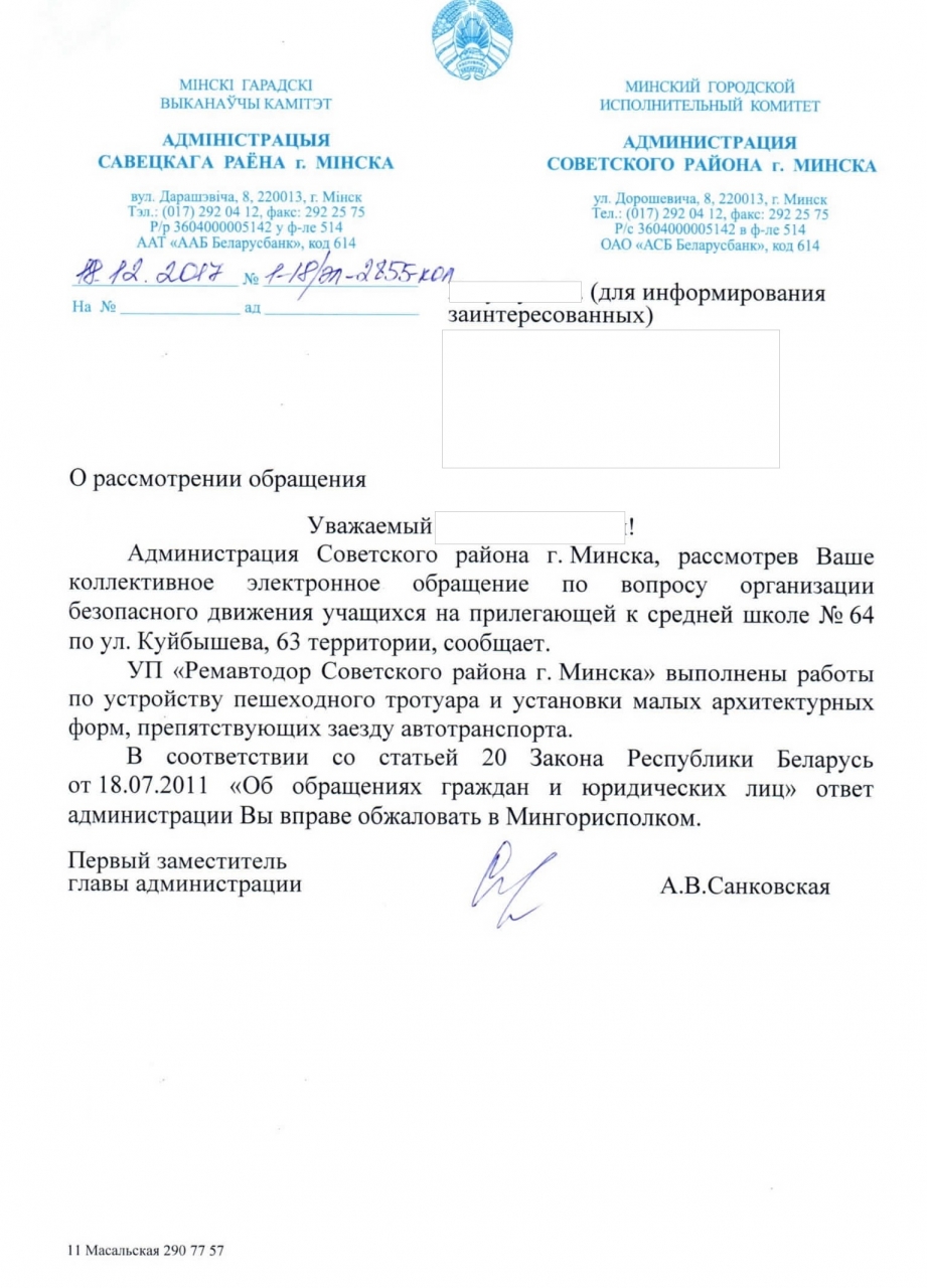 1 сентября 2017 г. открылась после ремонта обновленная, красивая минская школа №64, находящаяся по адресу Куйбышева, 63. Учеников встретила и обновленная территория. Однако за пределами территории школы дети встречаются с реальной опасностью. Тротуар заканчивается стихийной парковкой, детям приходится преодолевать эту территорию либо по зеленой зоне по колено в грязи, либо уворачиваясь от автомобилей, принадлежащих как жителям соседних домов и родителям учеников, так и посетителям расположенного неподалеку Комаровского Рынка. Просим обезопасить наших детей и осуществить безопасный маршрут передвижения для детей, в частности, проживающих в приписанных к этой школе домах: ул. Куйбышева 55, 57, 61 (к. 1,2,3), 69, ул. В.Хоружей 15, 17, 19, 21, ул.М.Богдановича 48, 50, 52, 52А, 52Б, 54, 56, 58, 58Б, 60, а также находящихся в процессе строительства жилых домов жилого комплекса "Престижино", маршрут которых проходит через это место.