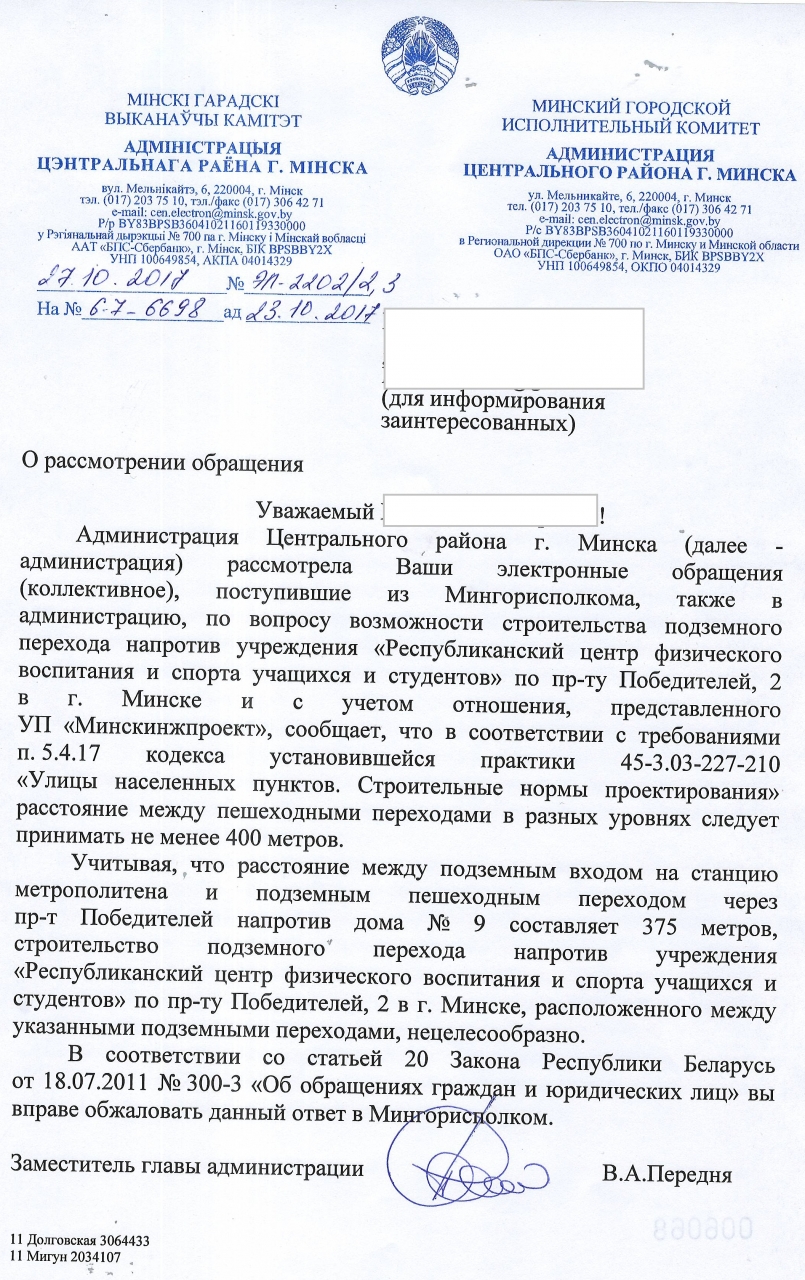 Просим рассмотреть предложение о возможности строительства подземного перехода напротив Республиканского центра физического воспитания и спорта учащихся и студентов по адресу: Минск, пр. Победителей 2.