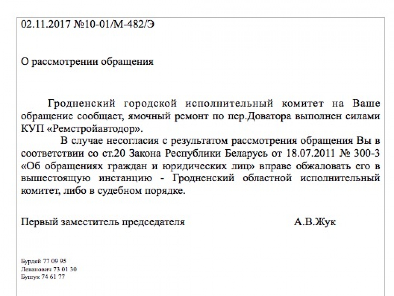 Хотелось бы решить проблему с дорожным покрытием по переулку Доватора в г.Гродно. Вдоль СШ №18, корпуса ГРгУ и детского садика в течение длительного времени образовывались ямы, которые либо ремонтировались косметически, либо не ремонтировались вообще. Вследствие этого полотно пришло в негодность, из-за чего многочисленные автомобилисты вынуждены подвергать свои автомобили риску поломок подвески и деформации шин. Просьба принять необходимые меры и привести дорожное полотно в надлежащий вид.