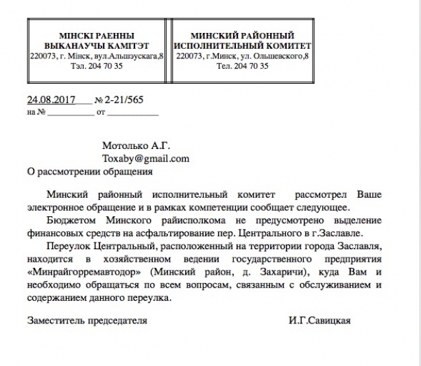 Ответы: Минского райисполкома, МИНРАЙГОРРЕМАВТОДОР в приложениях.