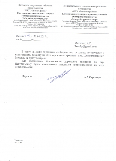 При формировании программы дорожных работ на 2018 год будет рассмотрен вопрос, о включении пер. Центральный, г. Заславль в план работ.