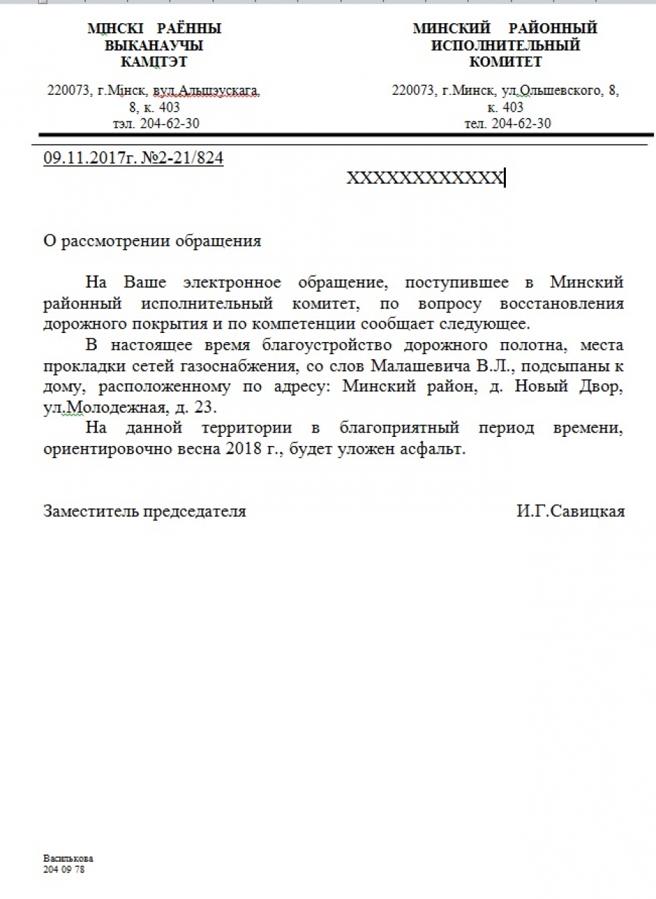 Поскольку статьей 41 Закона О местном управлении и самоуправлении установлено, что исполкомы организуют строительство, реконструкцию, ремонт и содержание местных автомобильных дорог, управляют дорожной деятельностью, связанной с автомобильными дорогами необщего пользования, просим принять меры по решению указанного вопроса.
