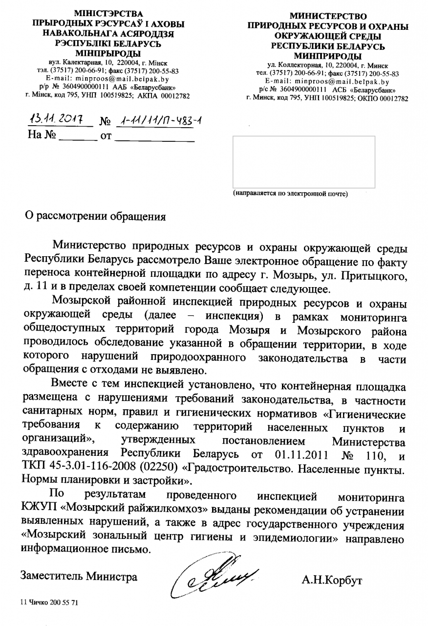 Прошу перенести мусорку со двора дома 11, по ул. Притыцкого г.Мозырь. Вот уже год как во двор нашего дома перенесли мусорные контейнеры от соседнего дома.Обращение в различные инстанции не дает никаких результатов. Постоянная антисанитария и мусор!!!! А ведь рядом находиться детская площадка!!! В 50 метрах находиться благоустроенная мусорка. Неужели нельзя перенести контенеры туда???