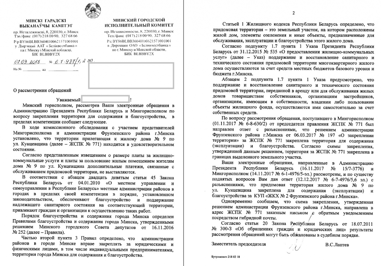 09.10.2017 года в ходе осмотра территории (аллея от ул. Кунцевщина до ул. Неманской) расположенной вблизи дома №9 по ул. Кунцевщина, по факту уничтожения зеленых насаждений специалистами УП "Зеленстрой" Фрунзенского района, представители эксплуатирующих и подрядных организаций указали на участки, находящиеся за пределами дворовых территорий, за которые, якобы несут ответственность ближайшие ЖСПК. 10.10.2017 года председатель правления ЖСПК-771 Иванов А.А. обратился в Администрацию Фрунзенского района за разъяснением и получил следующие документы: решение №197 от 06.03.2017 года (Приложение №1), выписку из Правил благоустройства и содержания г. Минска №252 от 16.11.2016г. с перечнем работ по содержанию (Приложение №2) и план закрепленной территории (Приложение №3).