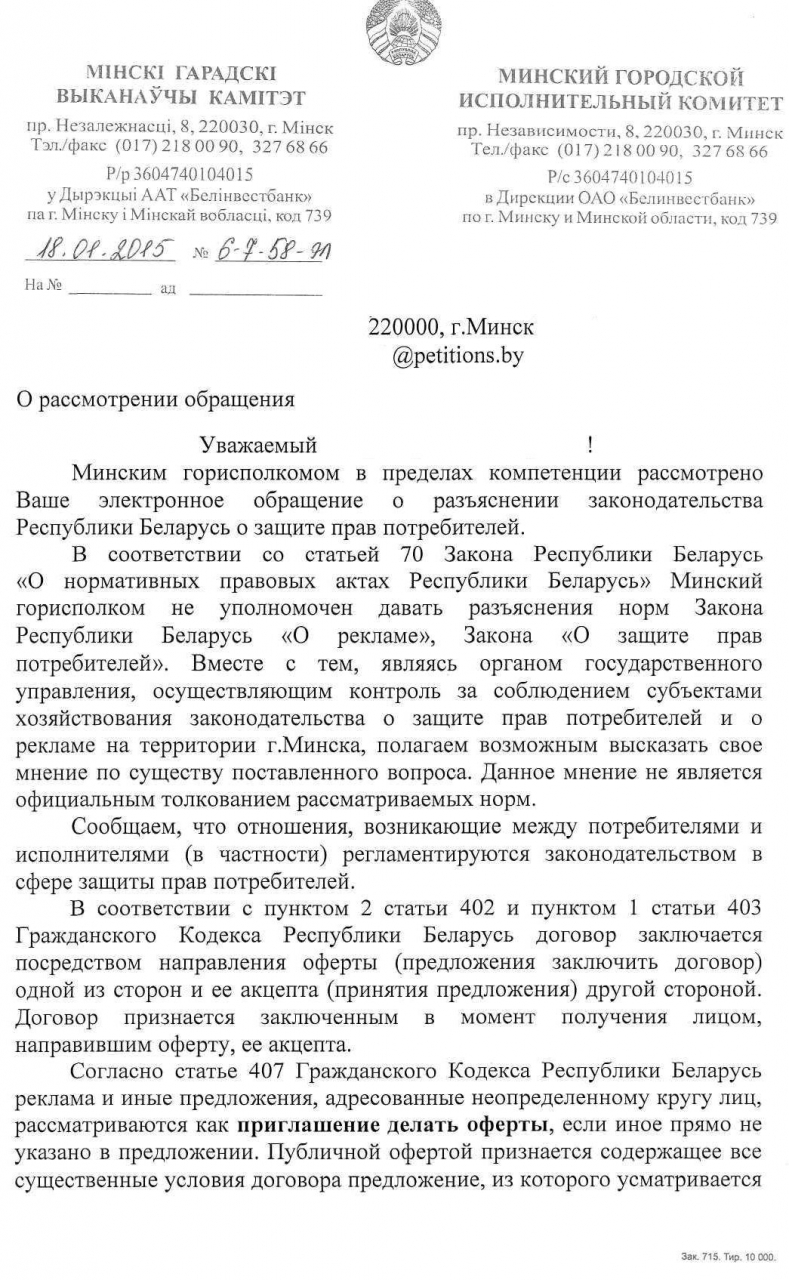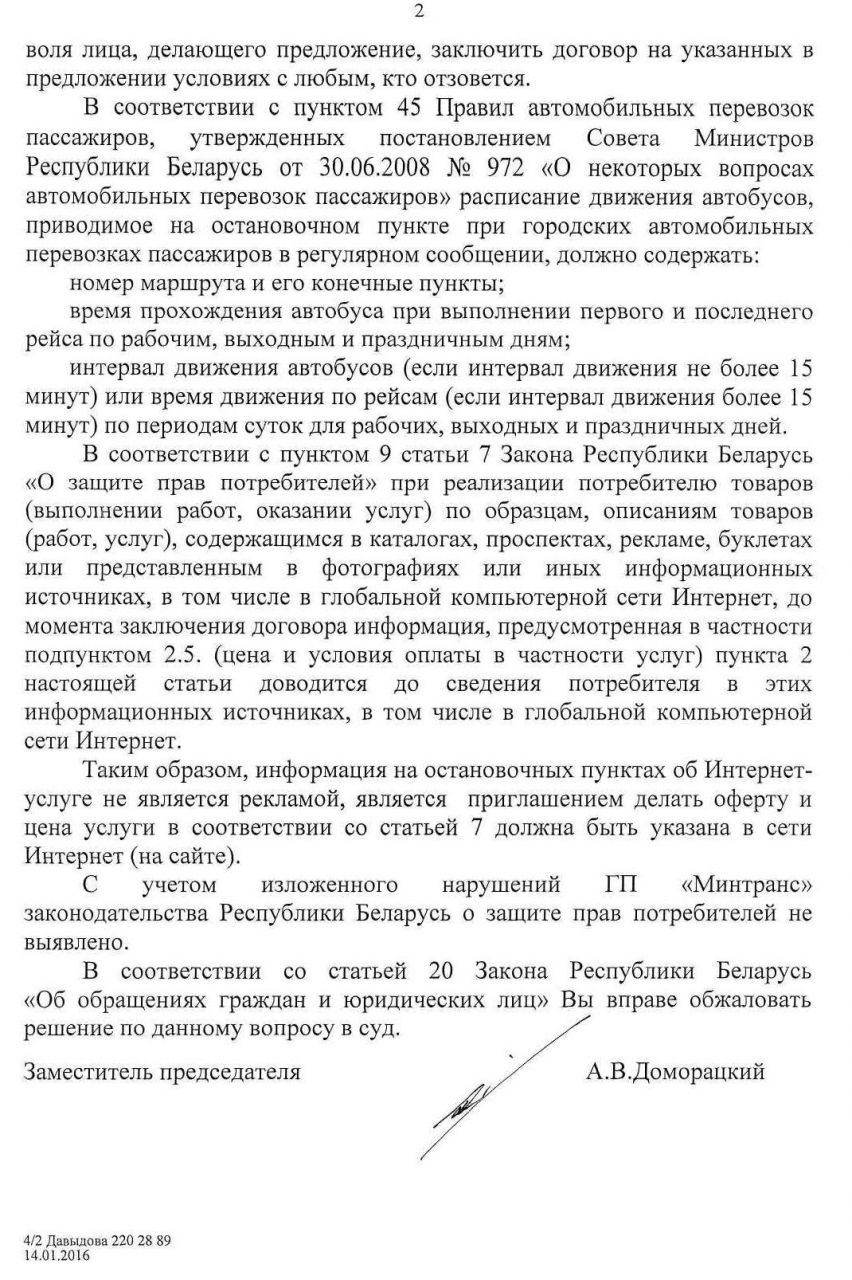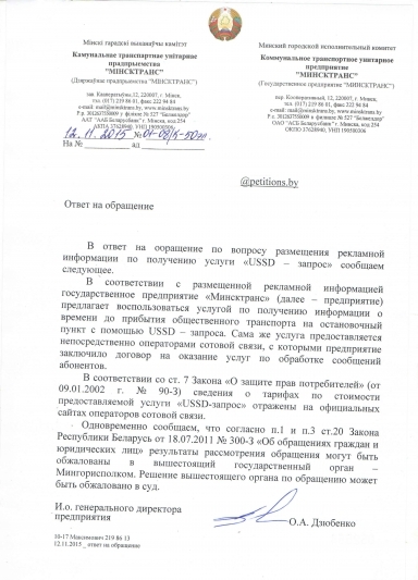 С соответствующим заявлением я обратился в ГП «Минсктранс» и просил принять меры к приведению информации об услугах в соответствие с законодательством. На указанное обращение предприятие дало ответ, что сведения о тарифах на услуги отражены на официальных сайтах сотовых операторов и нарушения не имеется.