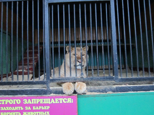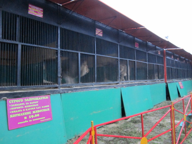Клетки с крупными животными очень маленькие, животные постоянно мечутся в них, подстилки не предусмотрены, пол присыпан минимальным слоем опилок, животные рычат пронзительным уставшим рыком.