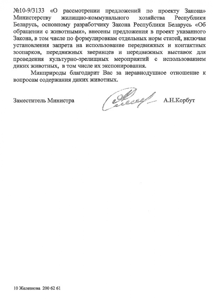 Минжилкомхозу как основному разработчику Закона "Об обращении с животными" внесены предложения о включении в проект закона норм о запрете передвижных и контактных зоопарков.