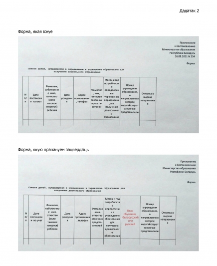 Далей, на этапе фарміравання агульнага “Спіса дзяцей, якія маюць патрэбу ў накіраванні ва ўстанову адукацыі для атрымання дашкольнай адукацыі”, усе дадзеныя заносяцца ў табліцу, якая таксама не мае графы з выбарам мовы навучання. Форму бланка, што існуе сёння, і форму бланка, якую мы прапануем зацвердзіць, дадаем да звароту (Дадатак 2).