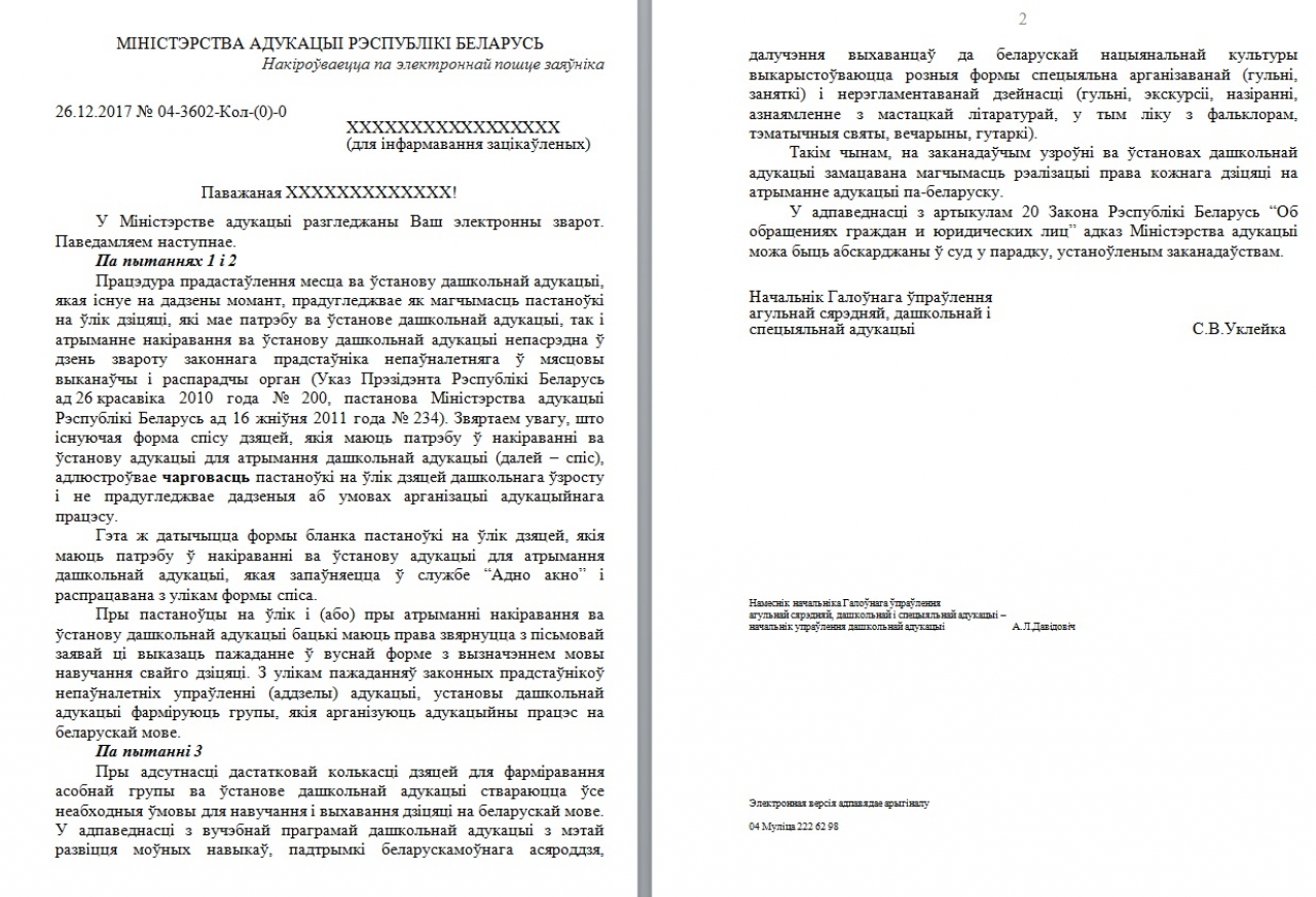 Таксама, мы маем права патрабаваць і мець магчымасць атрымання нашымі дзецьмі дашкольнай адукацыі на беларускай мове на тых жа ўмовах і ў тым жа парадку як і тыя, хто патрабуе і атрымлівае для сваіх дзяцей дашкольную адукацыю на рускай мове.