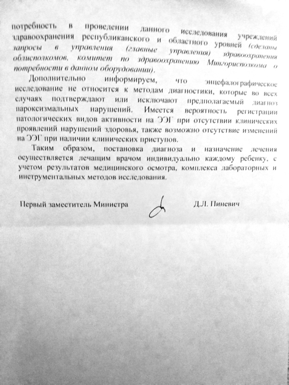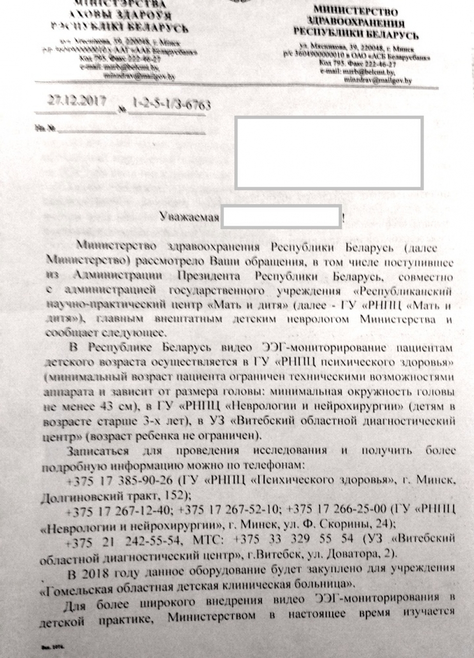 В тот момент, когда мы каждый день видели приступы у ребенка и ничем не могли ему помочь, мы столкнулись с очередной проблемой белорусской медицины: необходимое оборудование и квалифицированный сотрудник для проведения данной диагностики у ребенка первого года жизни по всей республике были только в одном (!!!) месте. Сотрудник, проводящий данное исследование был в отпуске и мы были вынуждены с маленьким, тяжелобольным ребенком ехать в Москву, для проведения диагностики.