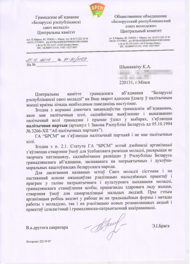 Согласно уставу ОО “Белорусский республиканский союз молодёжи” (далее — организация, БРСМ), организация не имеет политических целей, мотивов, а также не участвует в политической деятельности (что следует из ответа БРСМ Шинкевичу К. А. от 25.10.2017 01-30/1109). Однако согласно информации на официальном сайте организации (brsm.by) в нескольких статьях указывается, что организация принимала участие в сборе подписей за выдвижение кандидатов на пост Президента Республики Беларусь (http://brsm.by/news/aktivnaya-minshhina/ и http://brsm.by/news/30636/). На крупнейшем новостном сайте Республики Беларусь www.tut.by имеются статьи, подтверждающие факт сбора подписей за выдвижение Лукашенко на выборах в 2015 году (https://news.tut.by/society/458529.html). Организация устраивает политические пикеты: в частности, были организованы пикет возле центральной проходной ОАО “УКХ Бобруйскагромаш” (http://brsm.by/news/brsm-organizoval-piket-vozle-bobrujskagromasha/) и пикет в Витебске.