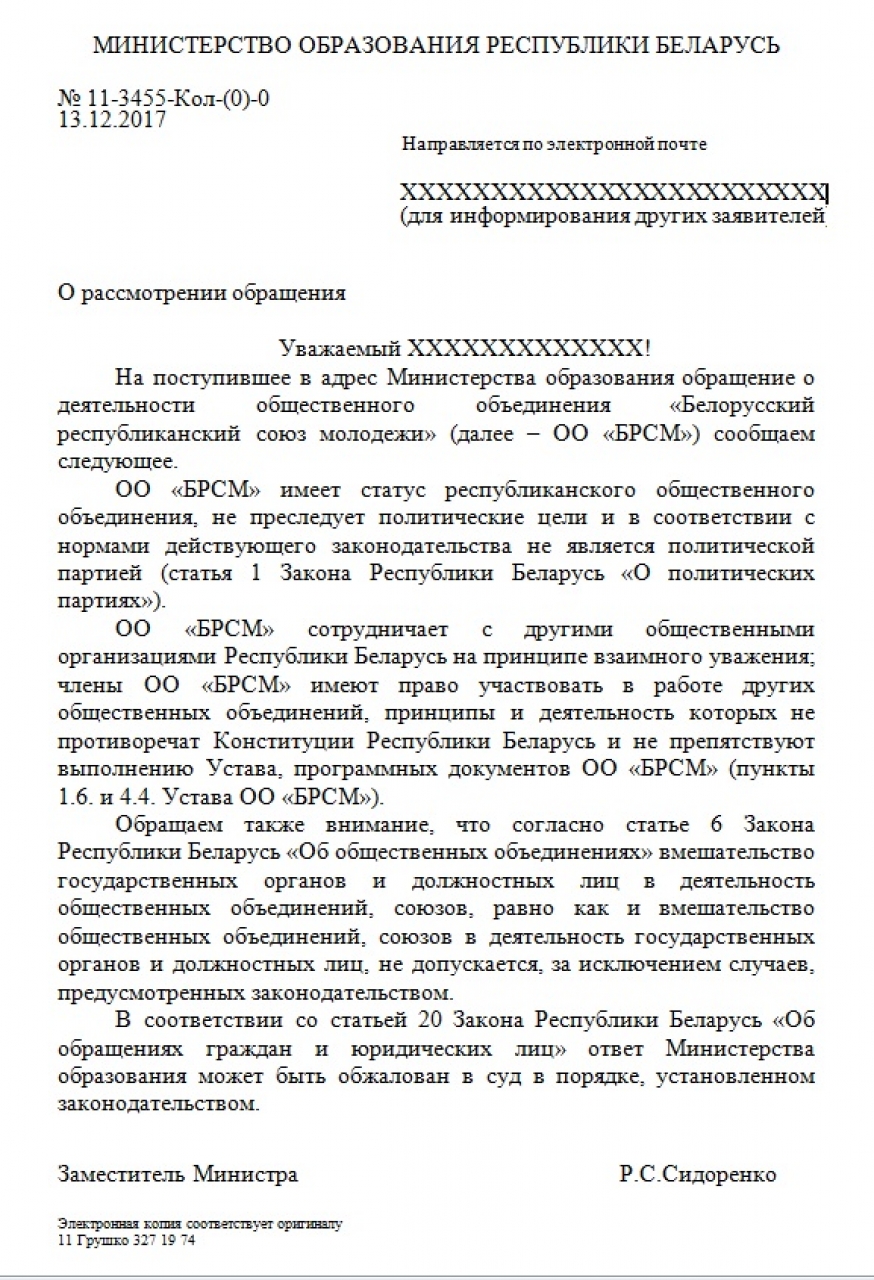 Просим: Принять все возможные меры к недопущению деятельности ОО “БРСМ” в учреждениях образования Республики Беларусь, с целью исполнения пункта 3 статьи 2 Кодекса Республики Беларусь “Об образовании” и защиты молодёжи от пагубного воздействия на них ОО “БРСМ”.