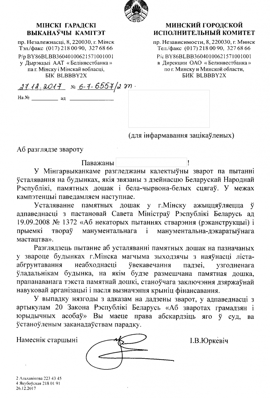 Павага і ўвага да сваёй гісторыі з'яўляюцца неад'емнай часткай моцнай нацыі і дзяржавы, таму прапаноўваем ушанаваць памяць пра Беларускую Народную Рэспубліку, устанавіўшы на будынках, якія звязаныя з яе дзейнасцю, памятныя дошкі і бела-чырвона-белыя сцягі (дзяржаўны сцяг БНР):