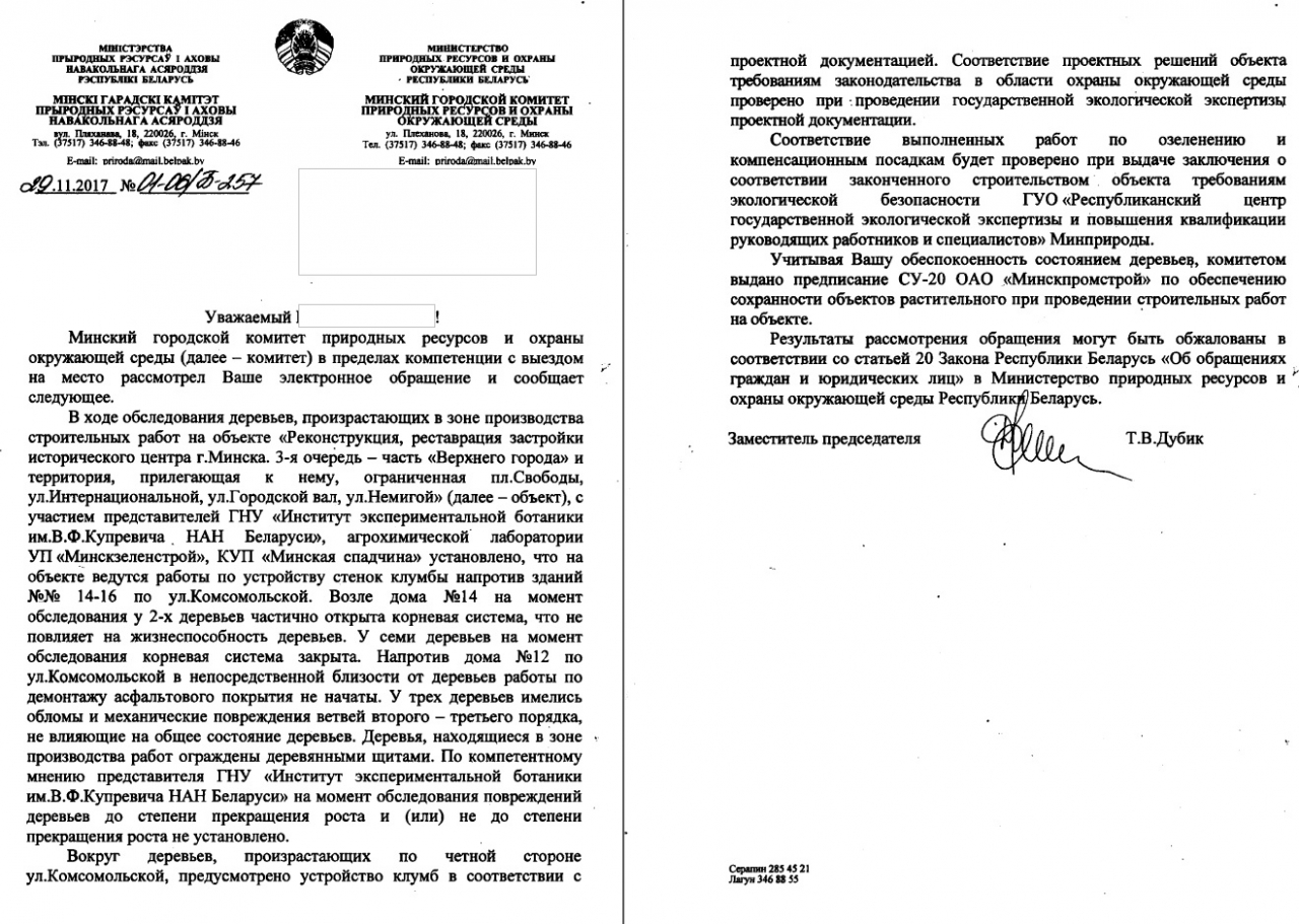 Обращаемся к Вам с Заявлением что,Заказчик в лице КУП Минская Спадчина в лице представителей отдела технического надзора Заказчика ,а также строители СУ – 71и СУ- 20 под руководством представителя Минскстроя ненадлежащим образом безответственно,халатно и безразлично подходят к вопросу сохранения лип по улице Комсомольской . https://news.tut.by/society/563521.html