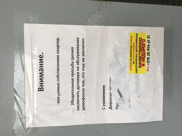 Объявления и листовки размещённые в неустановленных местах, а именно на входной домофонной двери дома 22 на ул. Алибегова в г.Минске нарушают эстетический вид городских улиц. Именно поэтому они строго запрещены. За расклейку объявлений лица привлекаются к административной ответственности по ч. 2 ст. 21.14 КоАП Республики Беларусь, за что налагается штраф в размере до 25 базовых величин, на индивидуального предпринимателя до пятидесяти базовых величин, а на юридическое лицо - от двадцати до ста базовых величин.