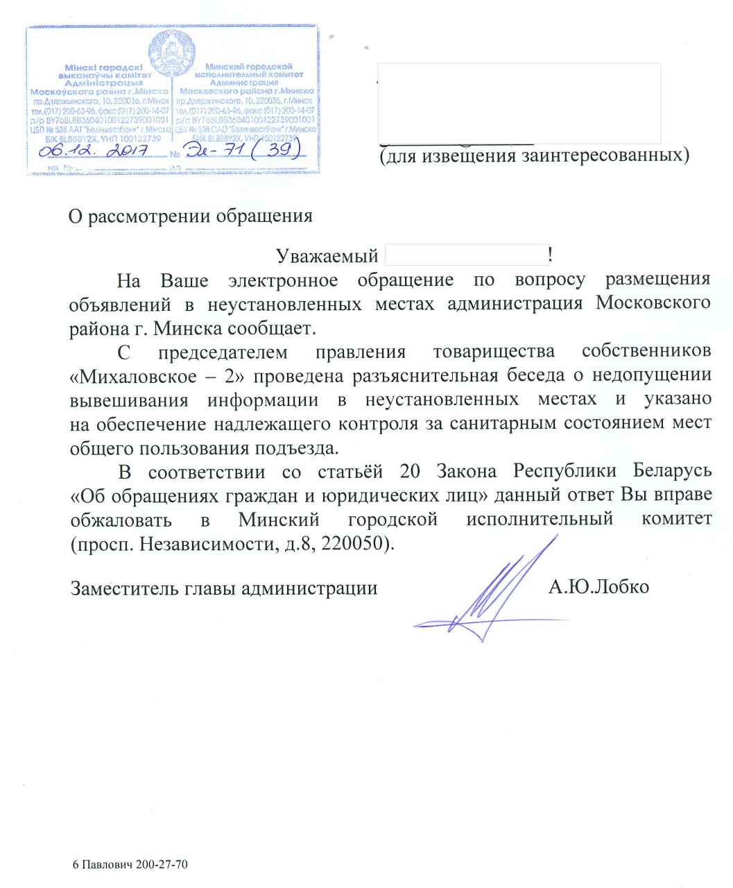 Размещать рекламные объявления допускается только на специально предназначенных для этого рекламных досках, щитах, т.к. согласно п. 38 Правил благоустройства и содержания г.Минска, утвержденных решением Мингорсовета депутатов от 16.11.2016 №252, объявления, плакаты, листовки и иные информационные материалы нерекламного характера размещаются в установленных местах. Просим привлечь к административной ответственности виновных лиц, расклеивающих объявления в неустановленных местах.