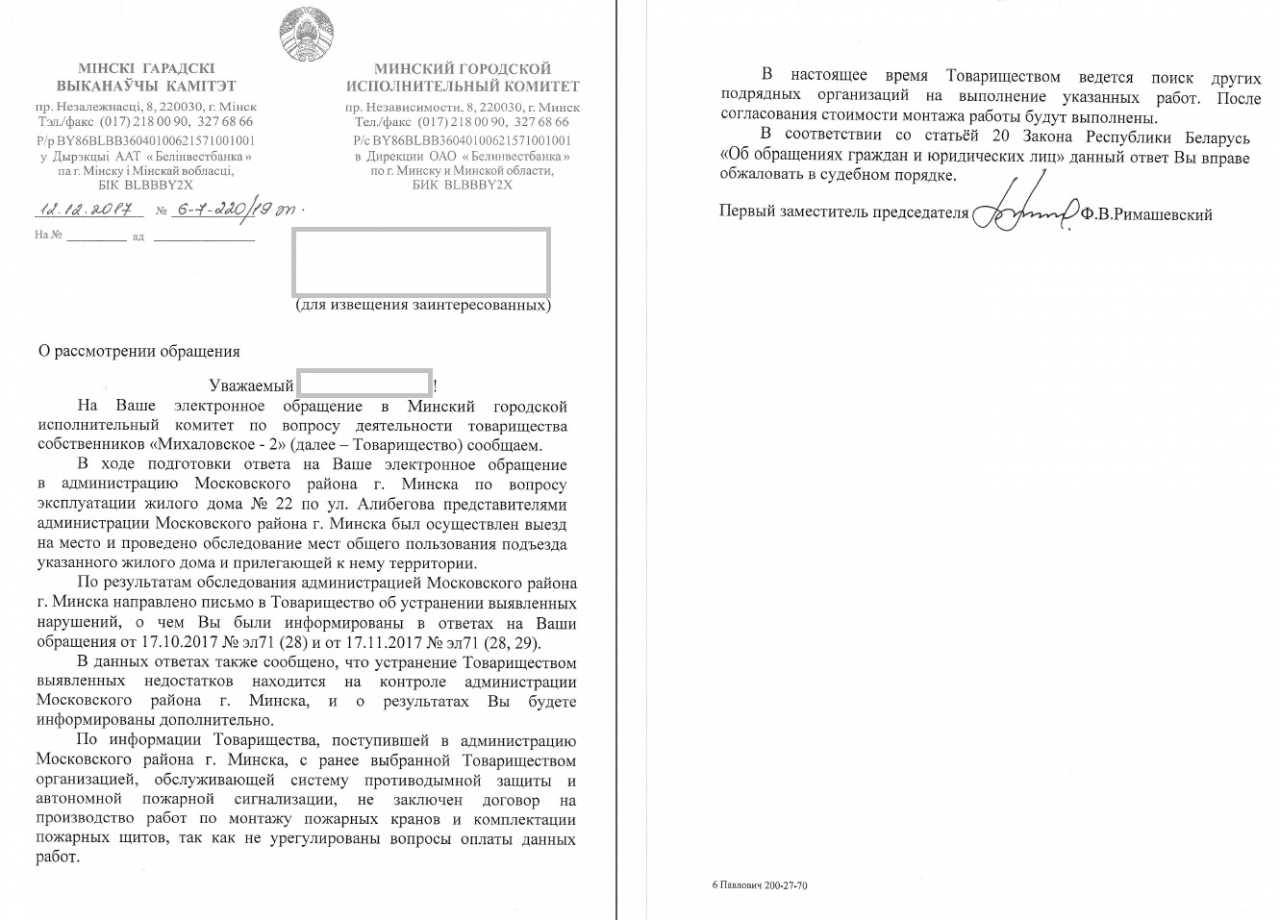 Просим обеспечить надлежащее рассмотрение обращения и исключить бюрократические проволочки в решении вопросов связанных с городским хозяйством, а именно с эксплуатацией 22 дома по ул. Алибегова в г. Минске.