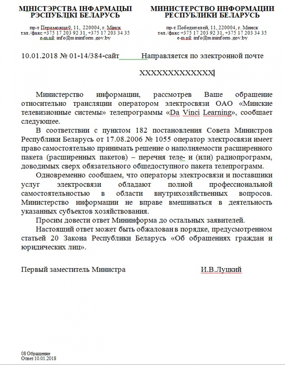 Министерство информации не вправе давать указания ОАО «Минские телевизионные системы» о том, какие каналы включать в сеть вещания.