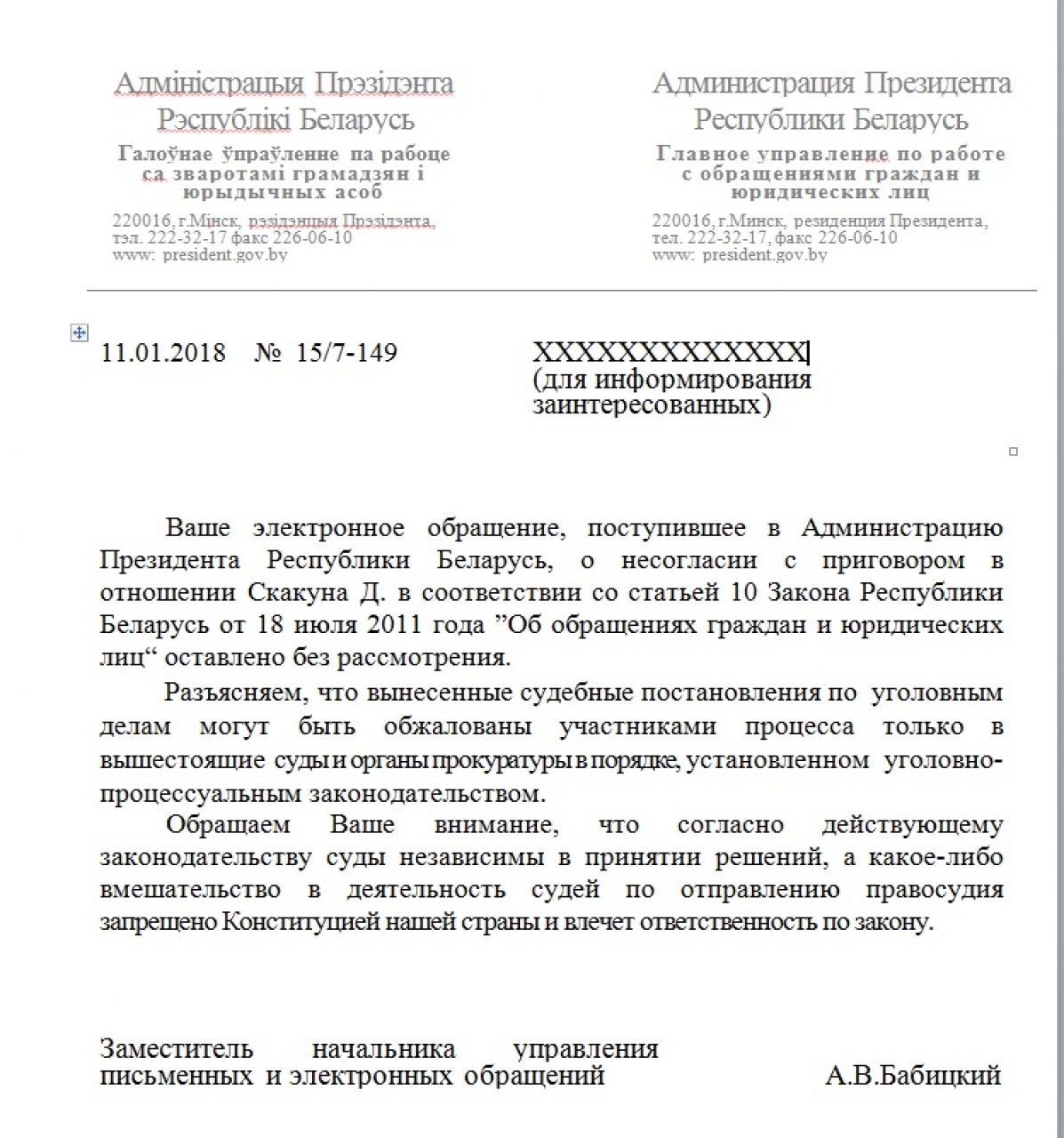 Мы, граждане Республики Беларусь, обращаемся к Президенту Республики Беларусь А. Г. Лукашенко и Государственному секретарю Совета Безопасности Республики Беларусь С. В. Засю с просьбой разобраться в этом деле и помочь восстановить справедливость. Для этого необходимо: