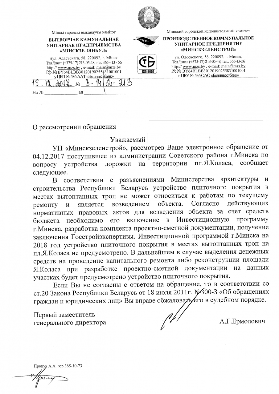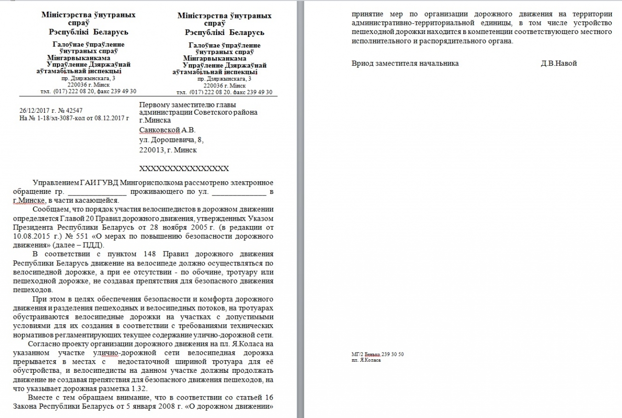 Согласно проекту организации дорожного движения на пл. Я.Коласа на указанном участке улично-дорожной сети велосипедная дорожка прерывается в местах с недостаточной шириной тротуара для её обустройства, и велосипедисты на данном участке должны продолжать движение не создавая препятствия для безопасного движения пешеходов, на что указывает дорожная разметка 1.32.