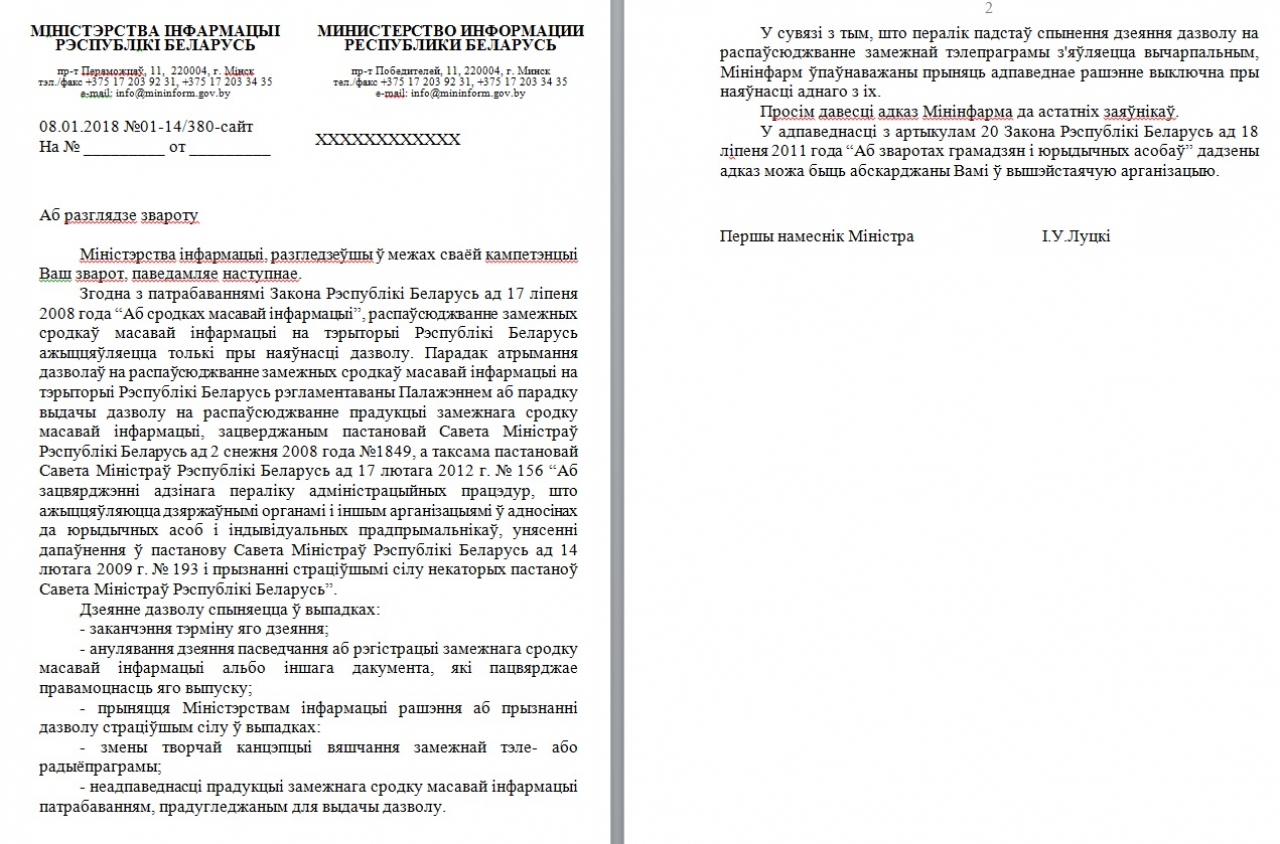 У сувязі з тым, што пералік падстаў спынення дзеяння дазволу на распаўсюджванне замежнай тэлепраграмы з'яўляецца вычарпальным, Мінінфарм ўпаўнаважаны прыняць адпаведнае рашэнне выключна пры наяўнасці аднаго з іх.