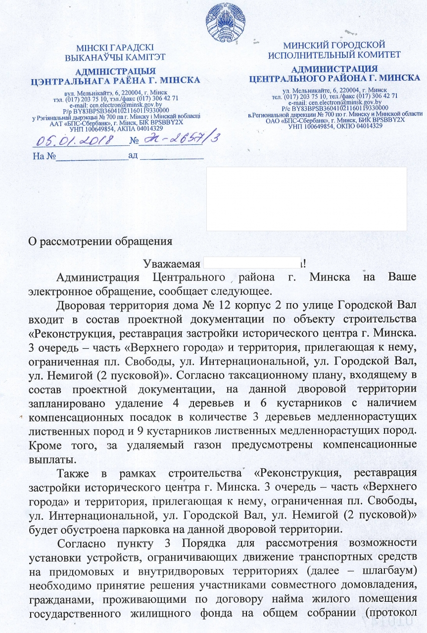Просим рассмотреть обращение по вопросу сохранения зеленой зоны и насаждений на внутридворовой территории при обустройстве двора по адресу г. Минск, ул. Городской Вал, дом 12 корпус 2 .