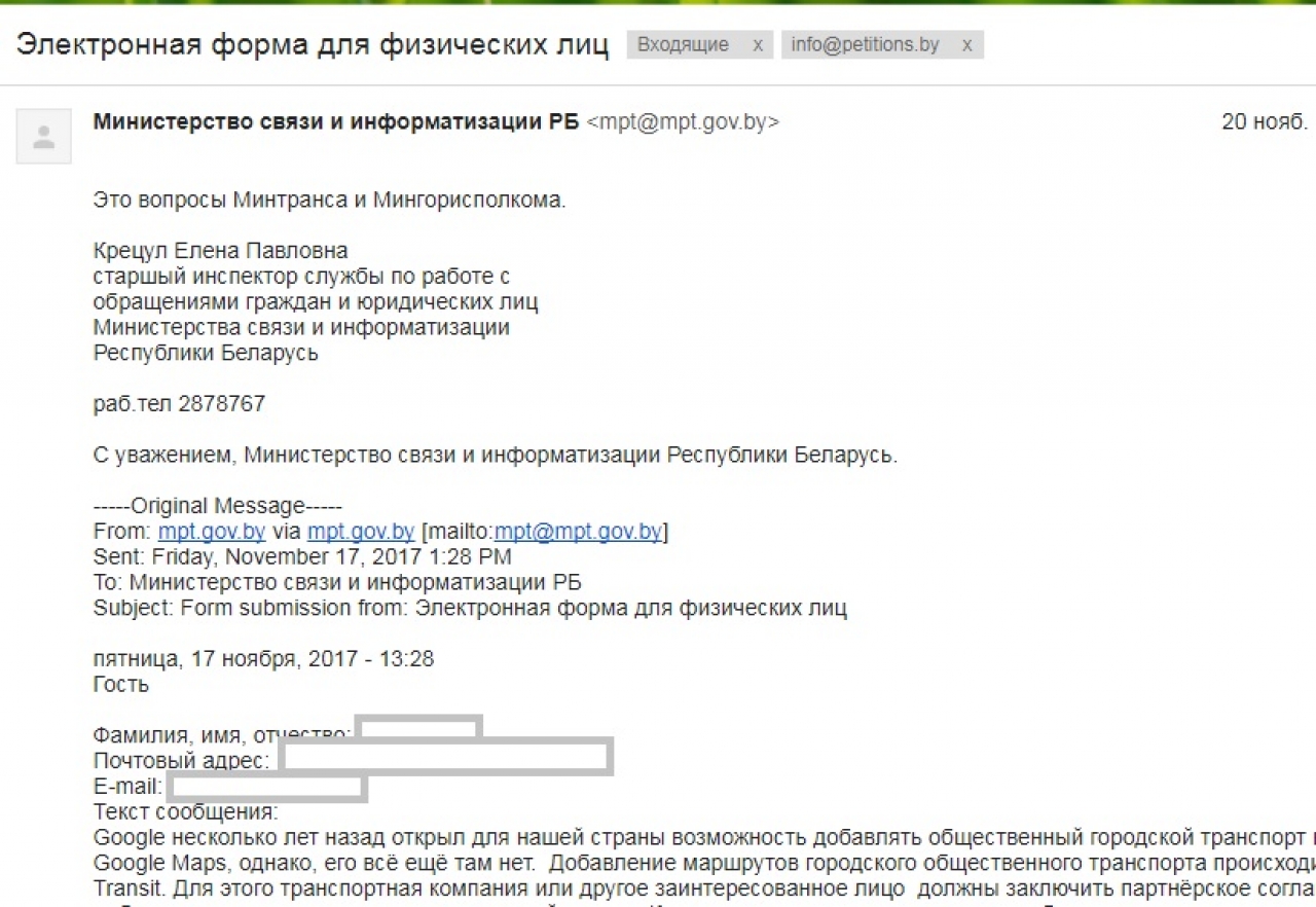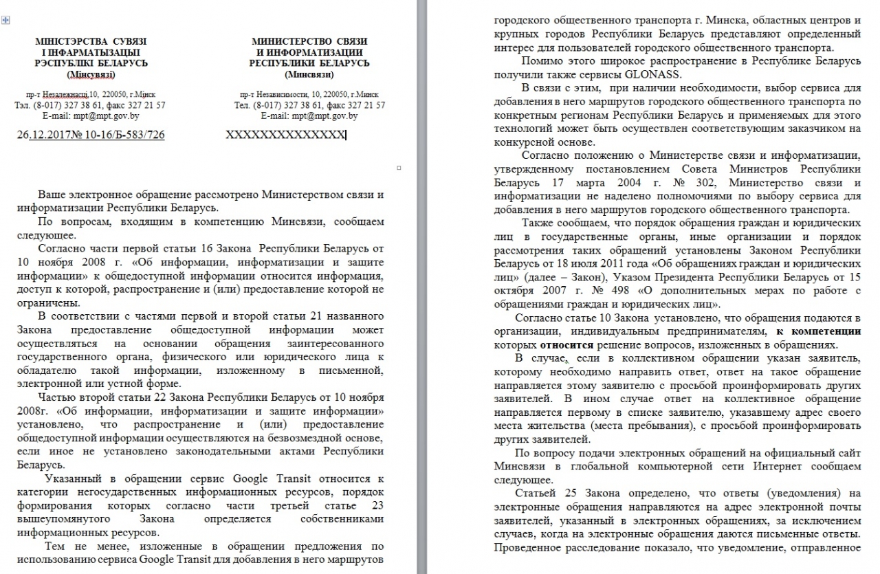 Как верно заметило Министерство транспорта в своём ответе на моё предыдущее письмо в своём ответе, который специально был прикреплен к обращению, вопросы использования различных информационных сервисов не относятся к транспортной деятельности. Зато как раз относятся к Министерству связи и информатизации. К Мингорисполкому решение данного вопроса тоже нельзя перенаправить, так как обращение касается транспортной схемы всей Республики, а не только Минска, а следовательно, Мингорисполком не сможет разобраться в данном вопросе для всех городов. Стоит заметить, что по итогу для реализации просьбы Вам всё же понадобится совместная работа с Министерством транспорта, но инициатива должна быть именно от Вашего министерства.