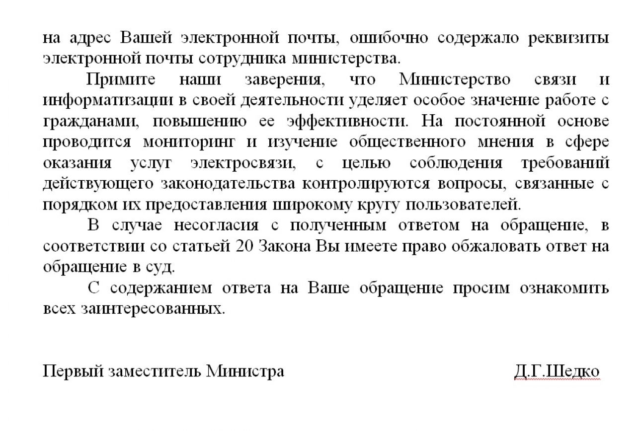 20 ноября 2017 мною получен отказ в рассмотрении направленного в Министерство связи и информатизации обращения (копия прилагается). Указанный ответ я считаю не соответствующим требованиям законодательства в части полного, всестороннего и объективного рассмотрения обращений и направления мотивированных и обоснованных ответов гражданам по следующим причинам:
