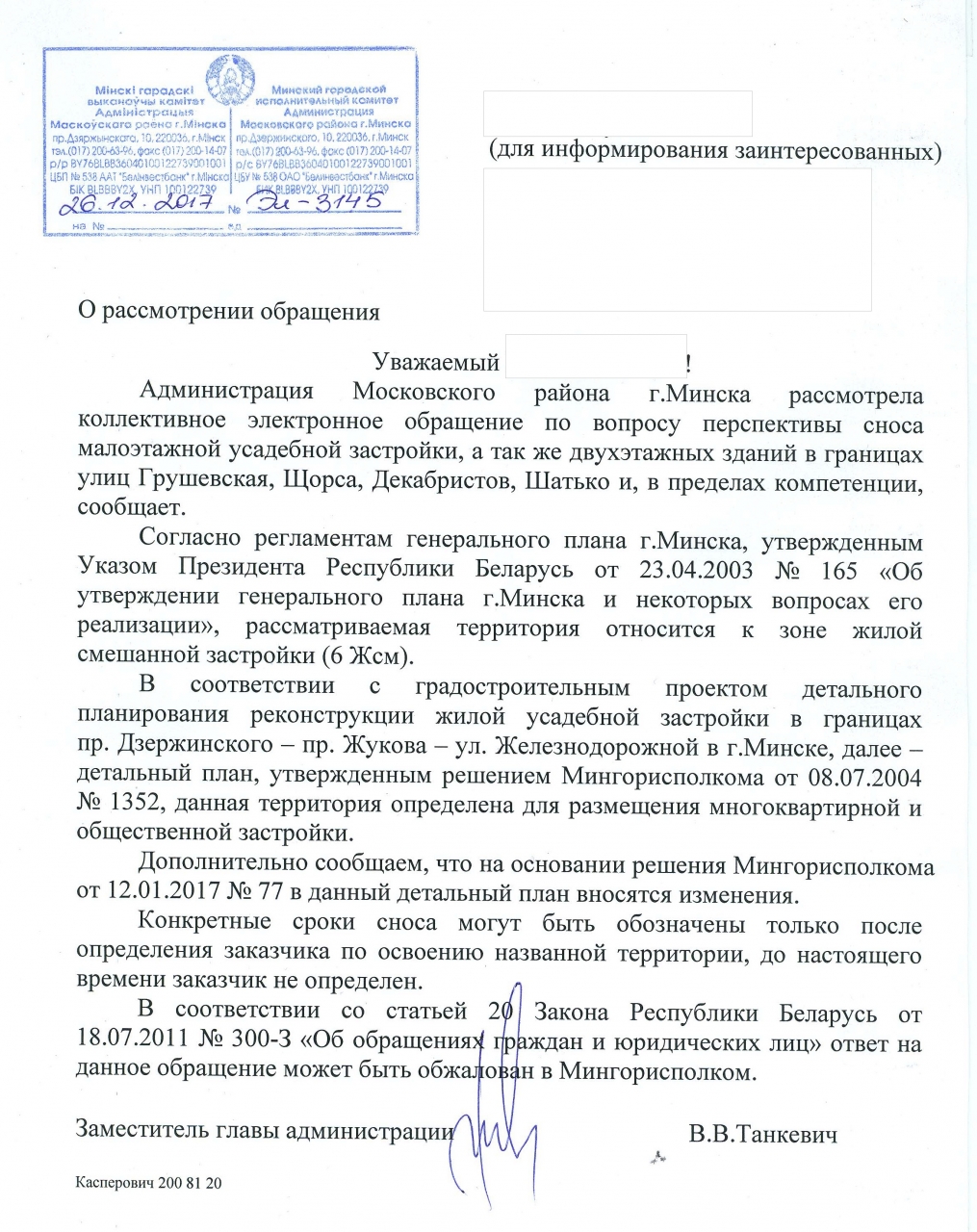 Просим сообщить, планируется ли и в какие сроки снос малоэтажной усадебной застройки, а также двухэтажек в границах улиц Грушевская, Щорса, Декабристов, Шатько.