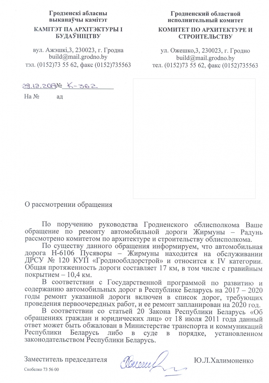 Просим сообщить, имеются ли планы реконструкции автодороги Жирмуны - Радунь (Вороновский р-н, Гродненская область) с целью повышения ее транспортно эксплуатационных показателей с переводом дороги в более высокую категорию. На данный момент твердое покрытие = гравий. Скорость движения легкового автомобиля составляет 20 км/ч из-за большого количества камней, ям и дорога со временем становится похожа на стиральную доску, доставляя существенный дискомфорт автомобилистам.