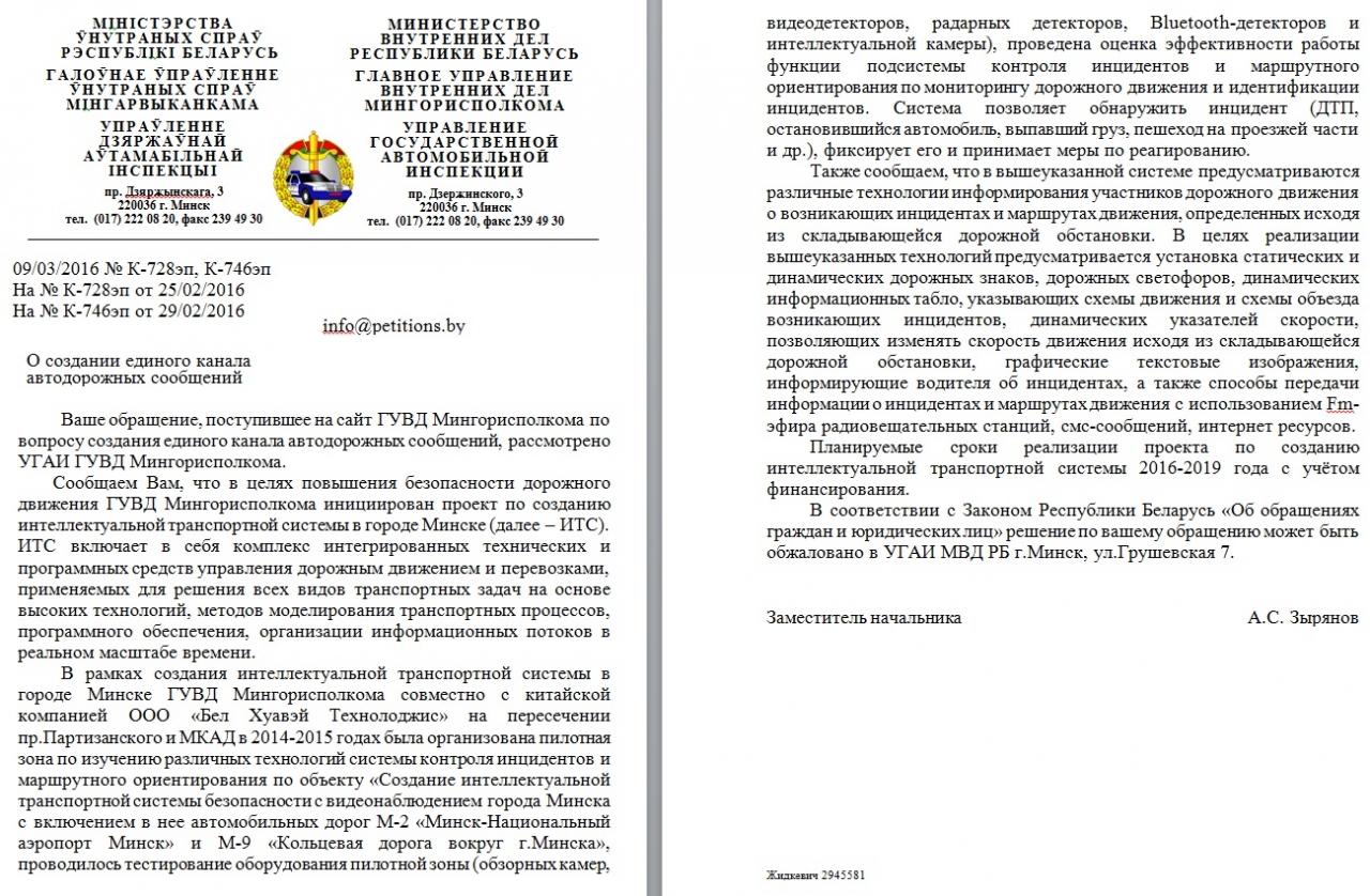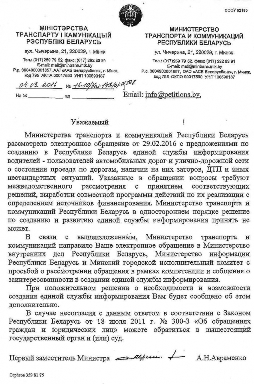 Указанный вопрос требует межведомственного рассмотрения. Министерство транспорта направило обращение в Мингорисполком, МВД и Мининформ для совместного рассмотрения вопроса и выработки совместной программы действий.